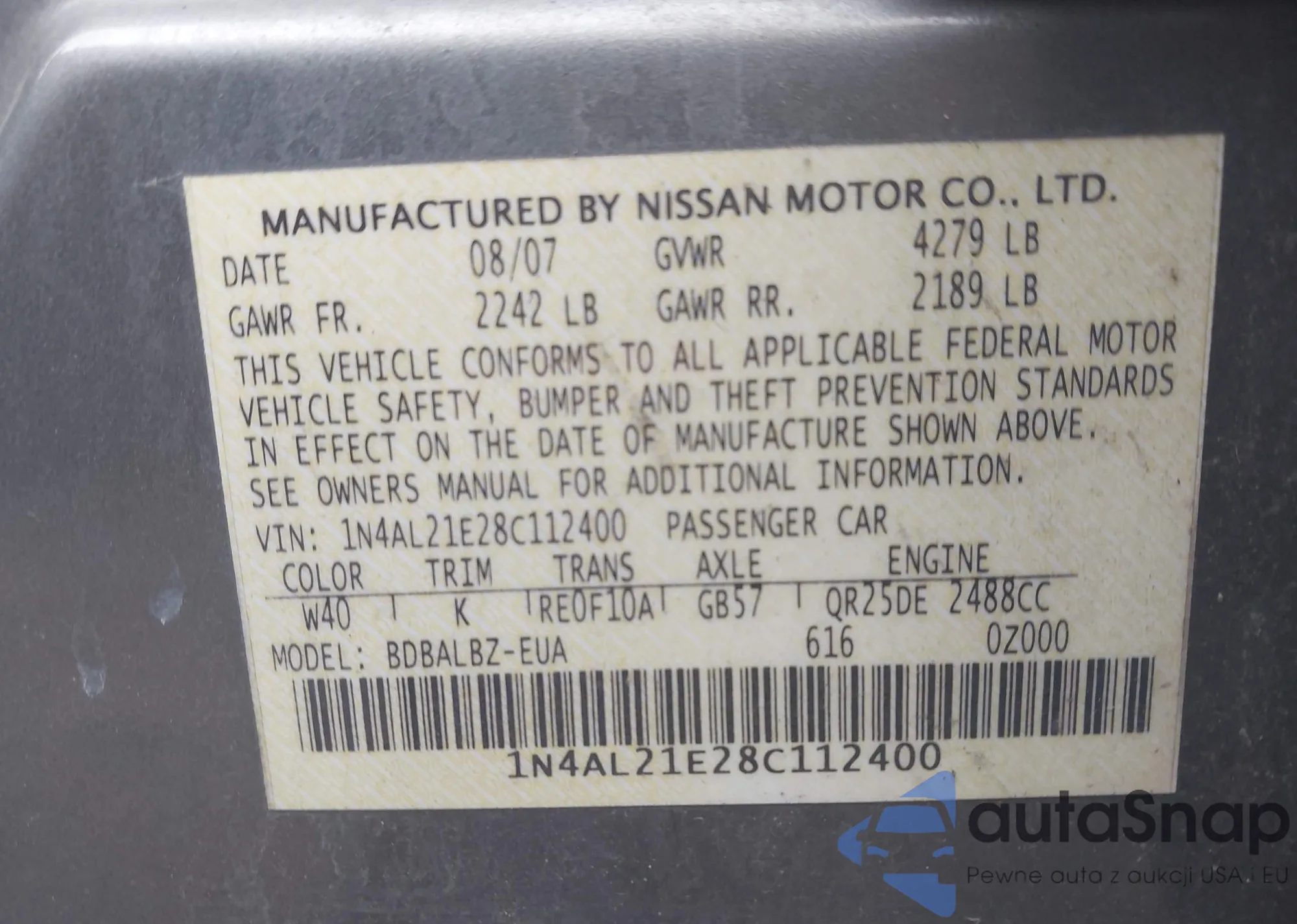 LOT: 42667943 VIN: 1N4AL21E28C112400