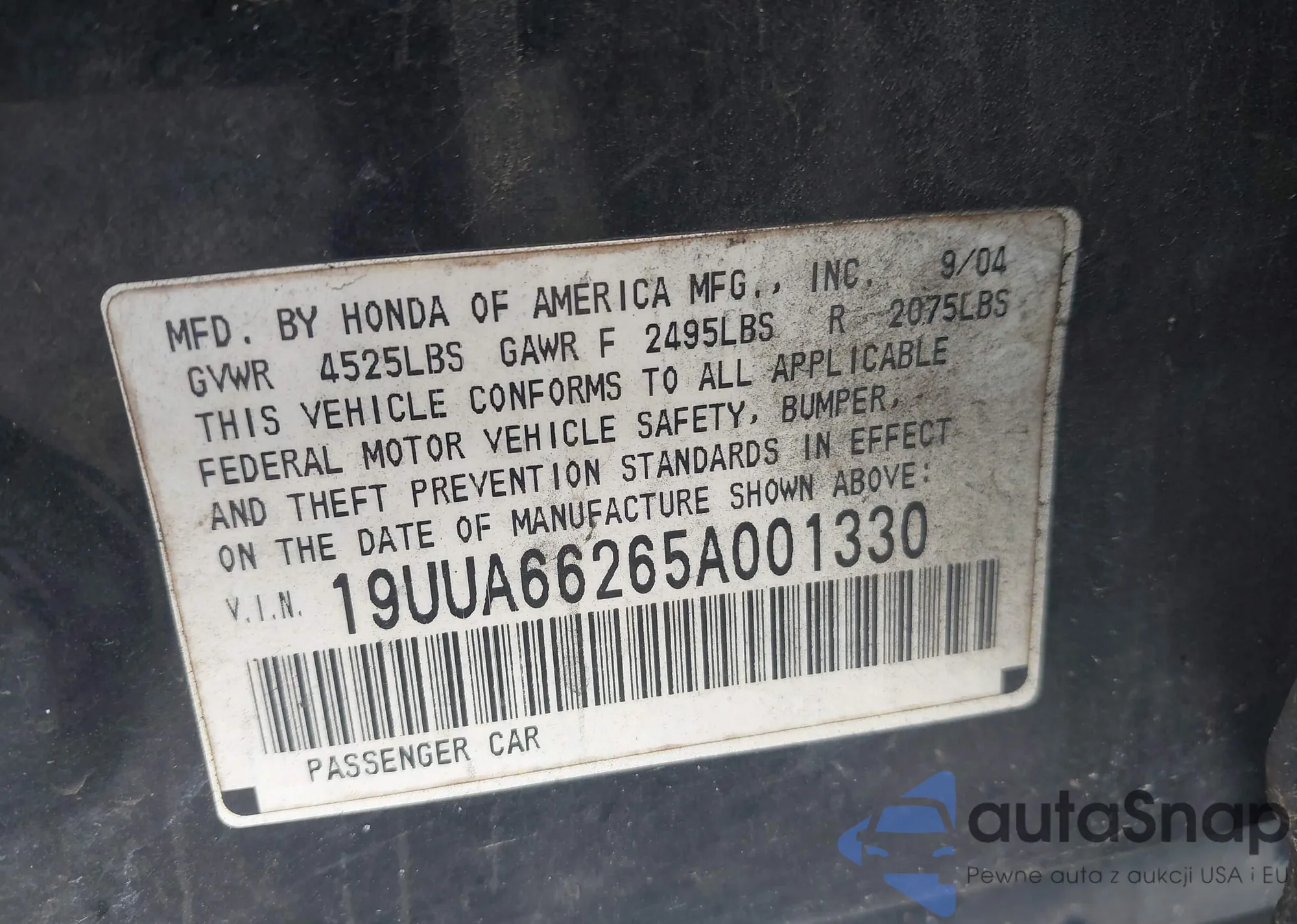 LOT: 42705902 VIN: 19UUA66265A001330