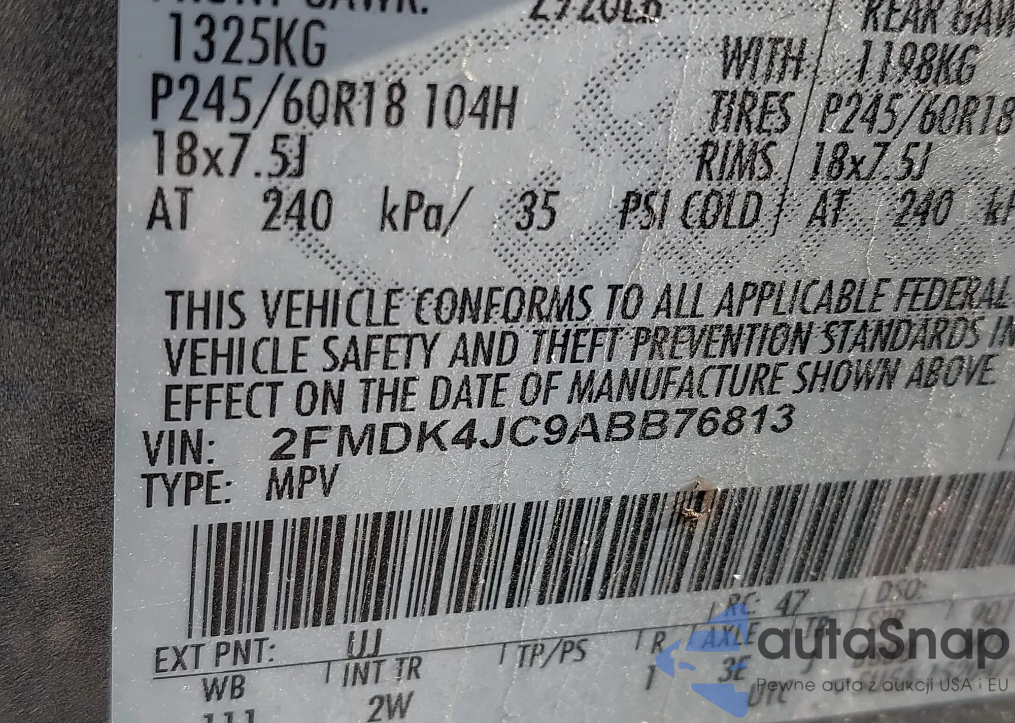 LOT: 42732810 VIN: 2FMDK4JC9ABB76813