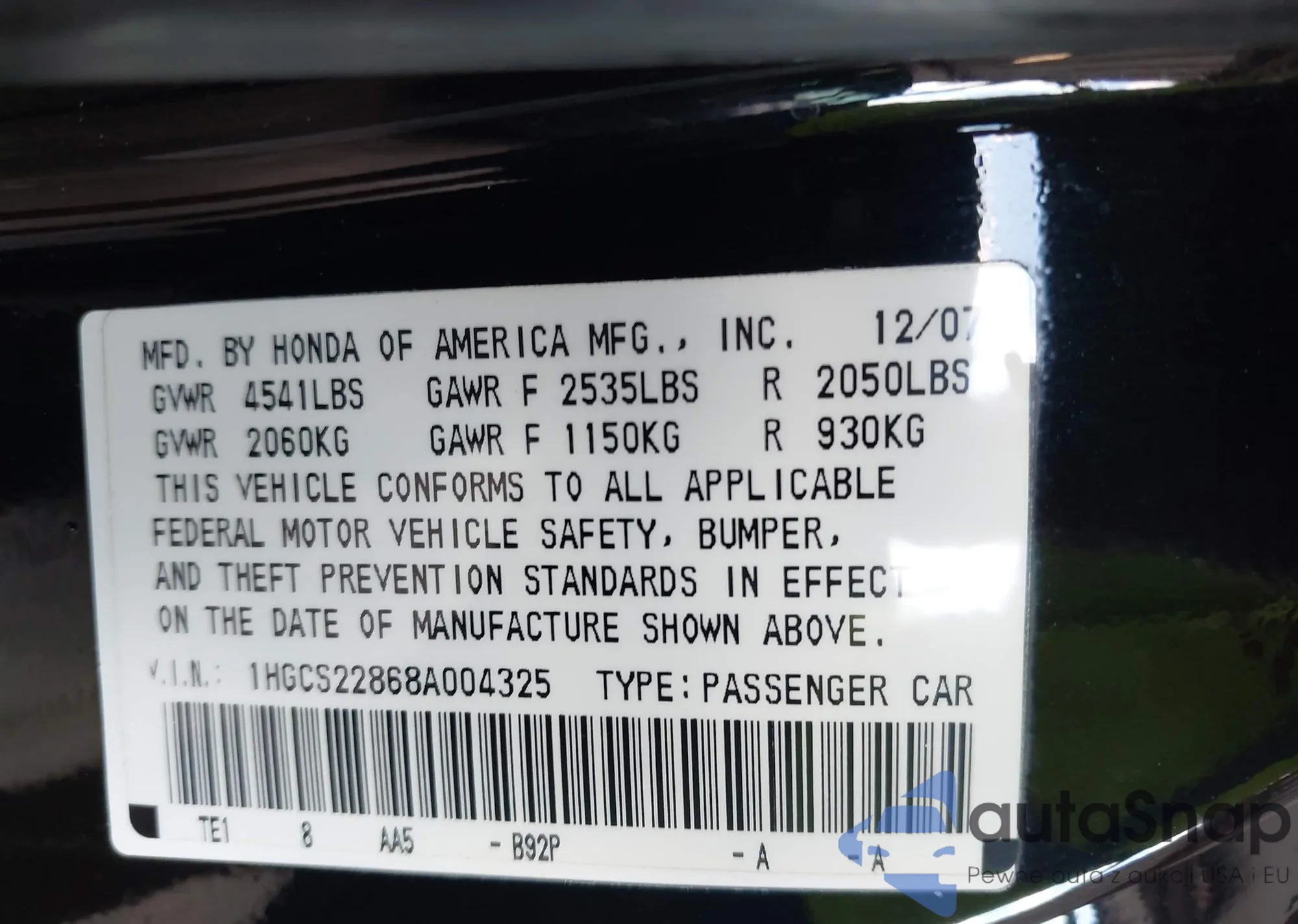 LOT: 42891654 VIN: 1HGCS22868A004325