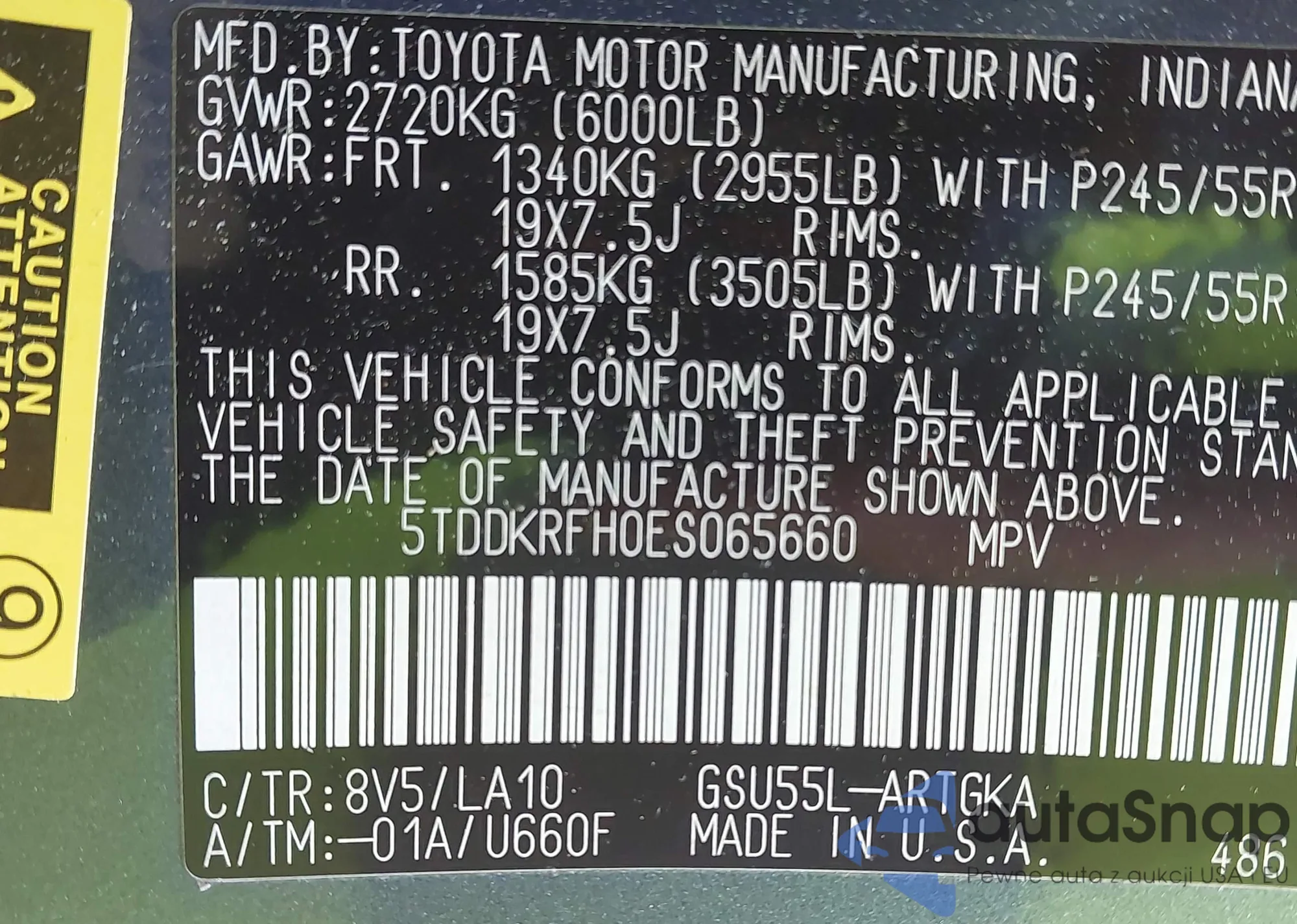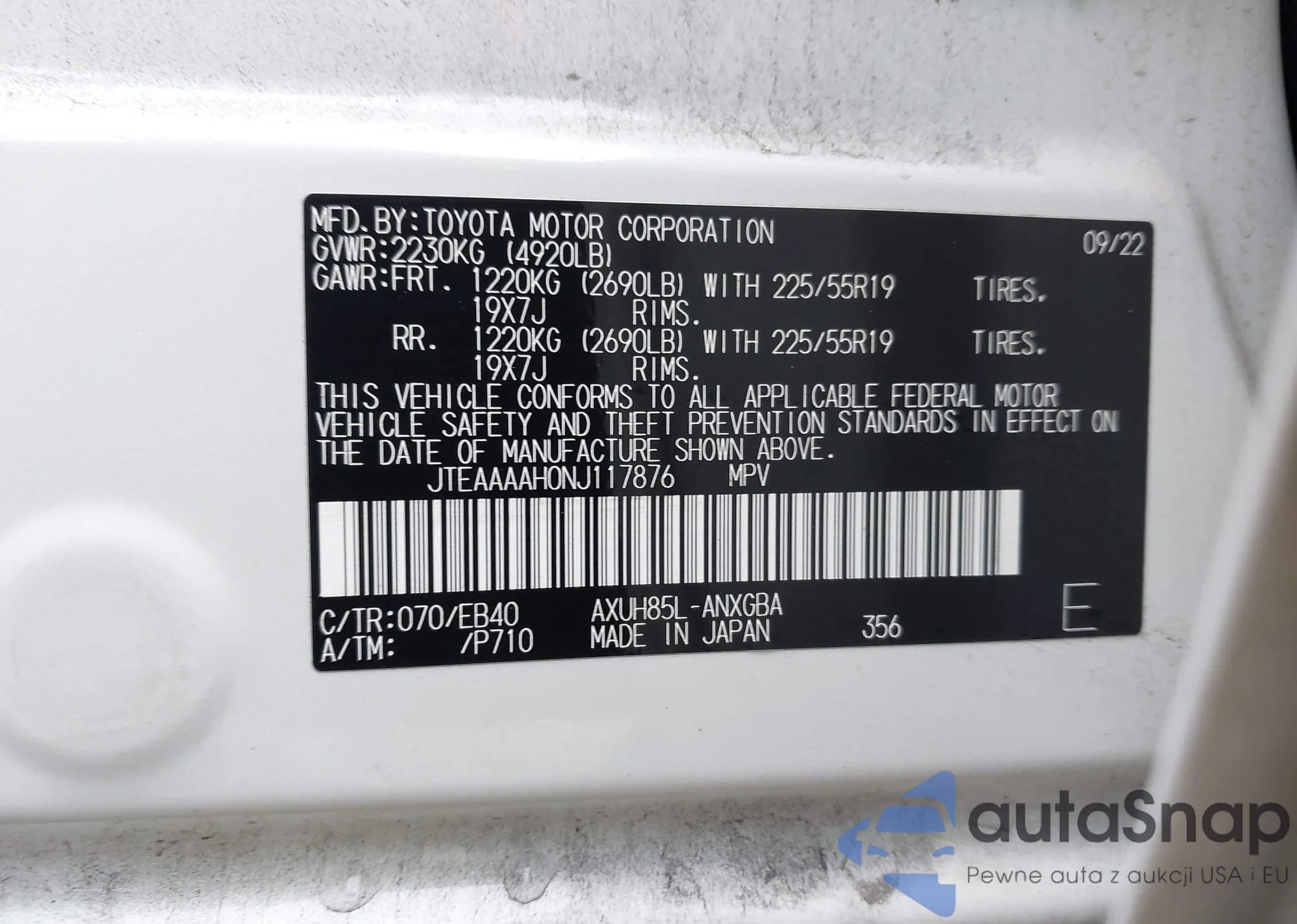 LOT: 42334327 VIN: JTEAAAAH0NJ117876