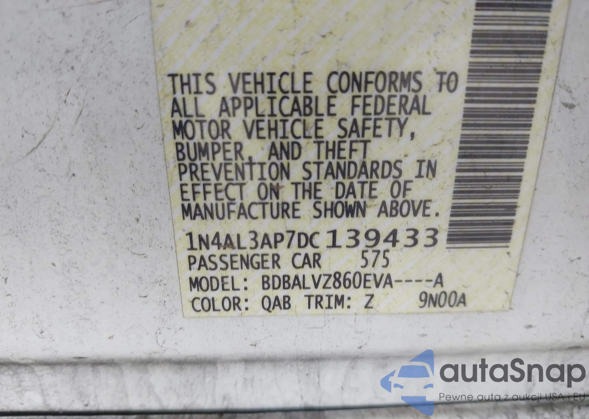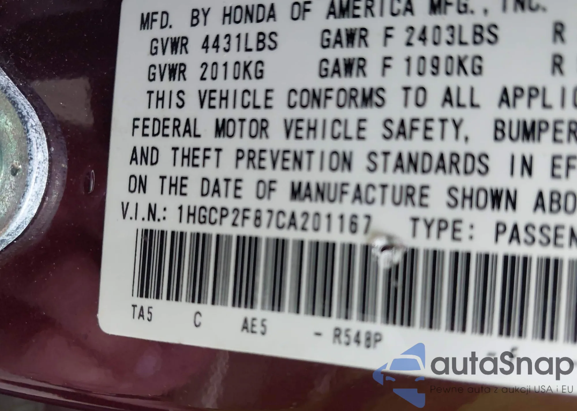 LOT: 42534710 VIN: 1HGCP2F87CA201167