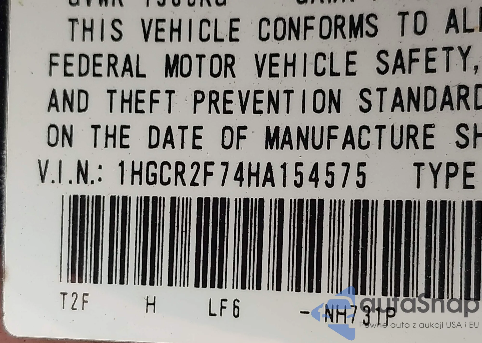 • VIN 1HGCR2F74HA154575