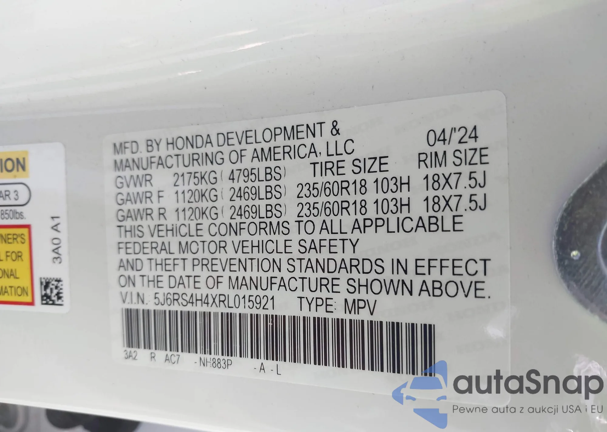 • VIN 5J6RS4H4XRL015921