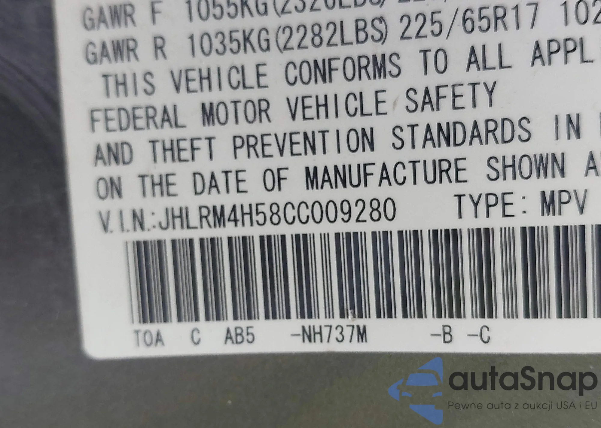 • VIN JHLRM4H58CC009280