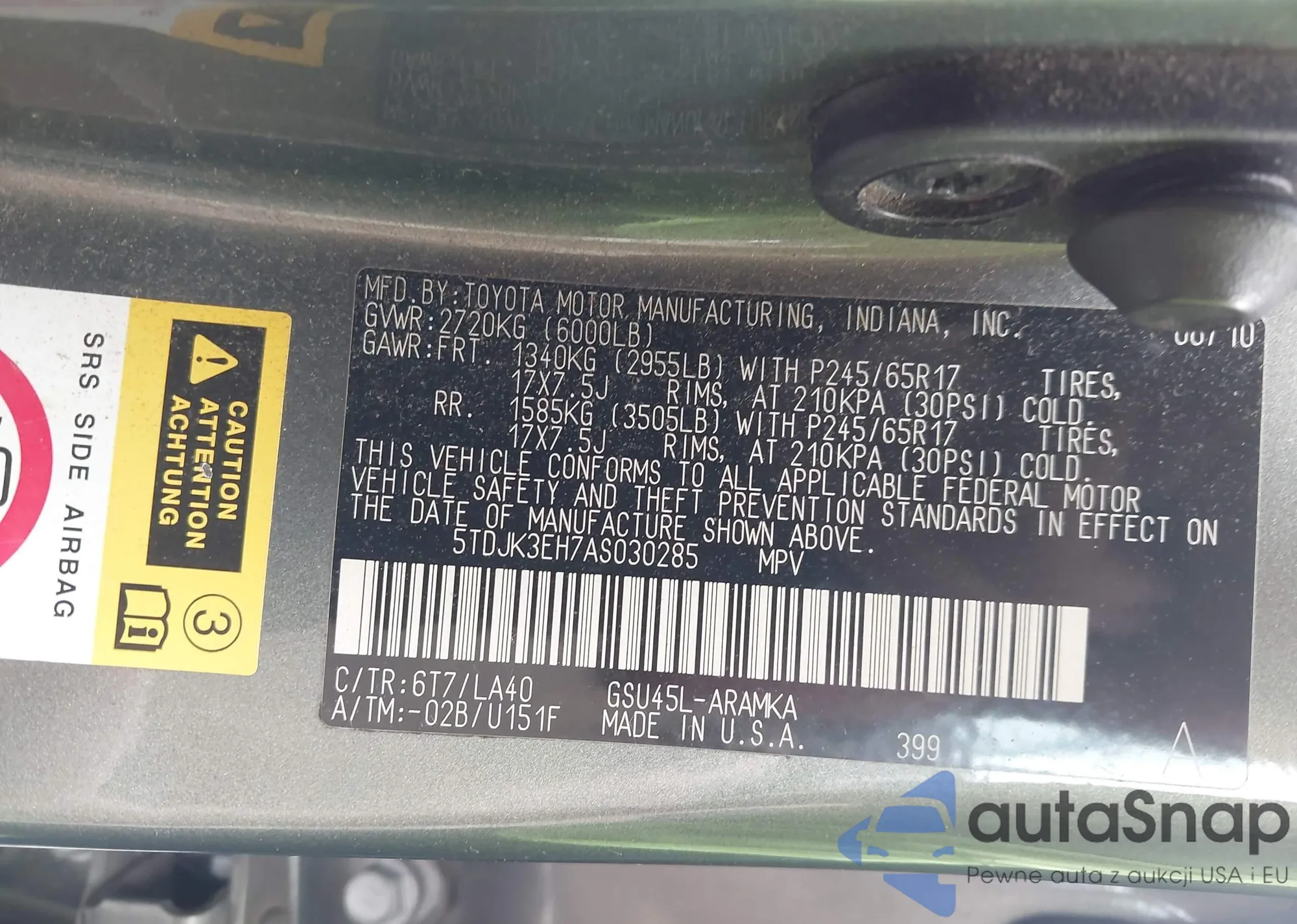 LOT: 42786541 VIN: 5TDJK3EH7AS030285