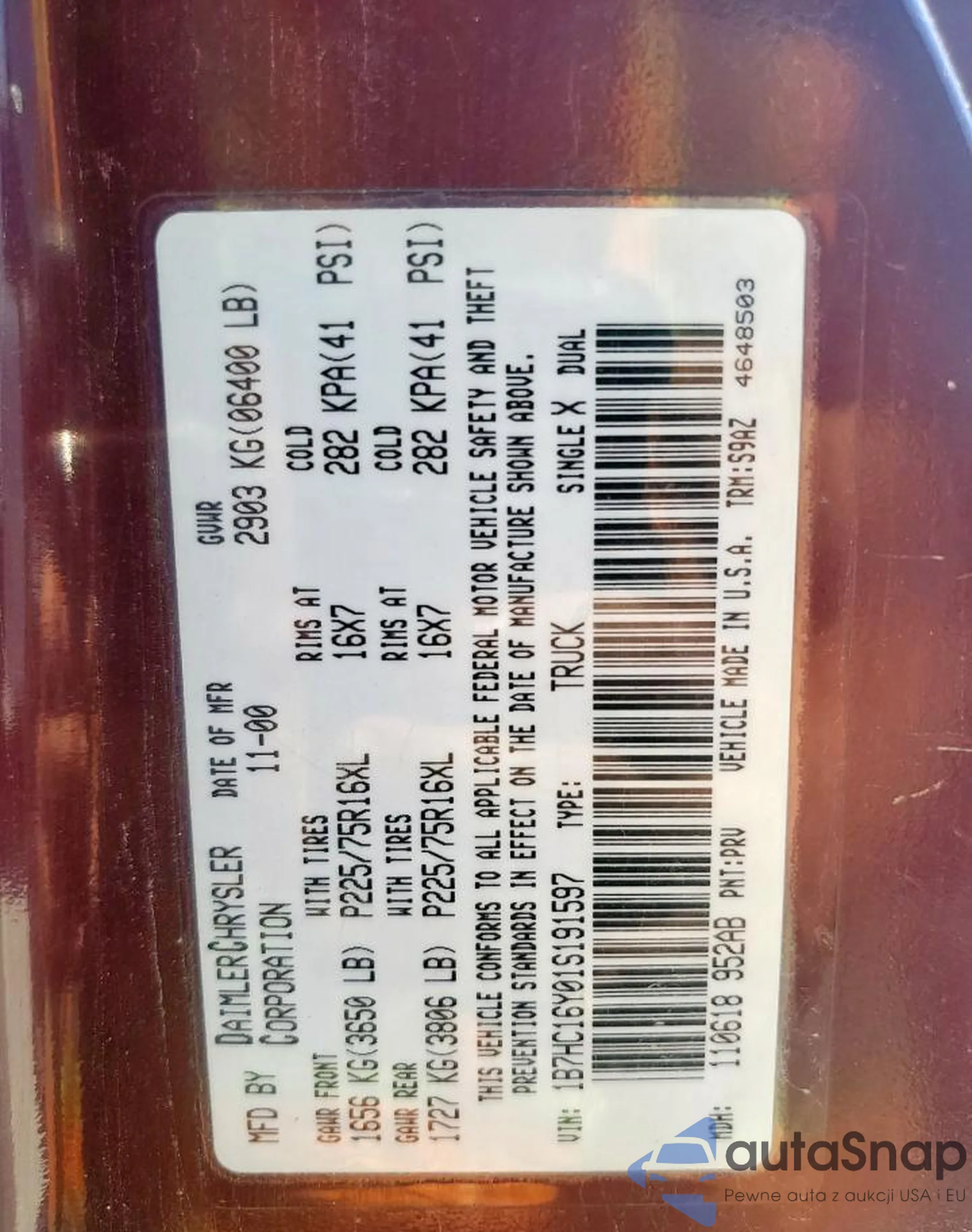 • VIN 1B7HC16Y01S191597