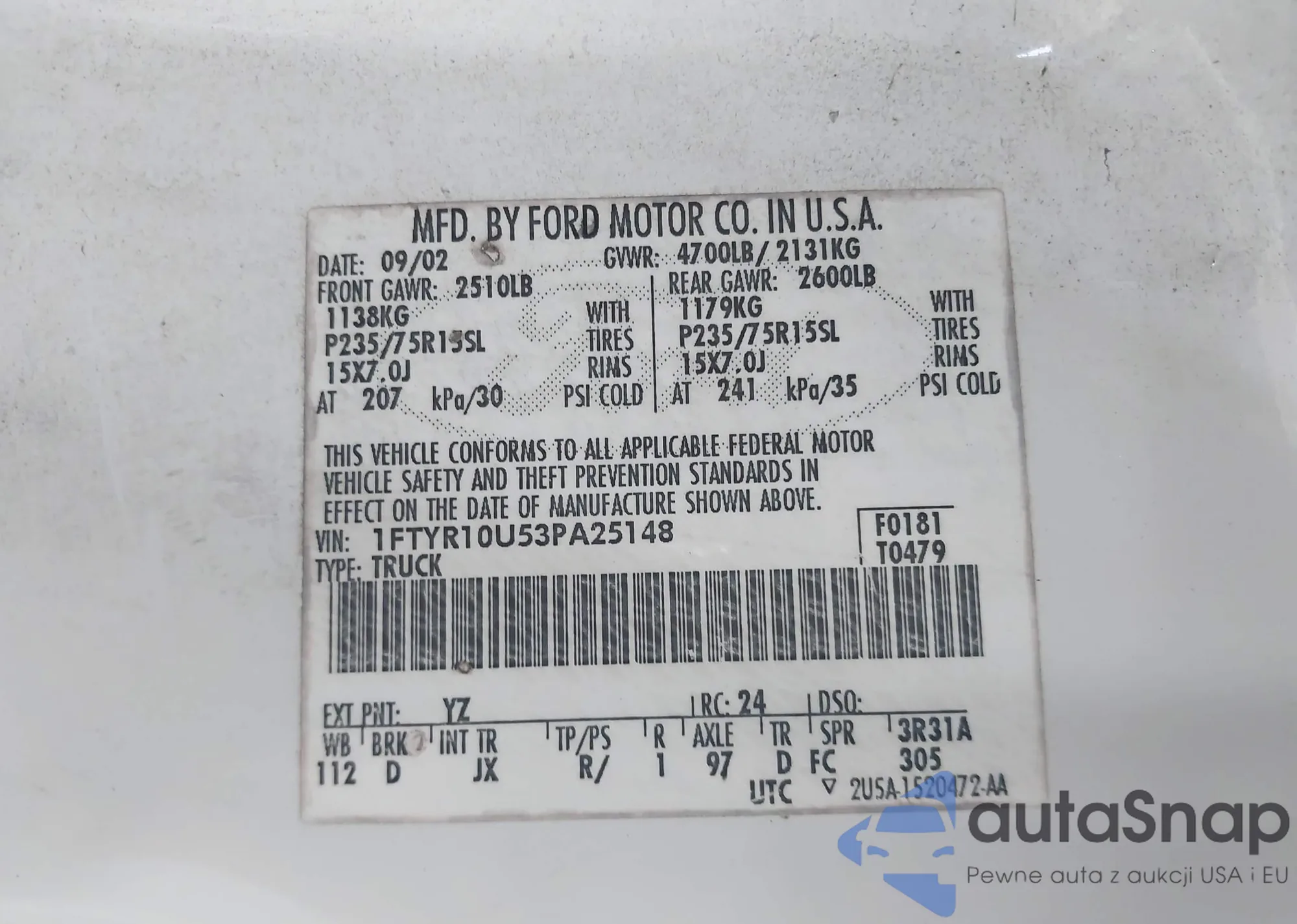 LOT: 42930244 VIN: 1FTYR10U53PA25148