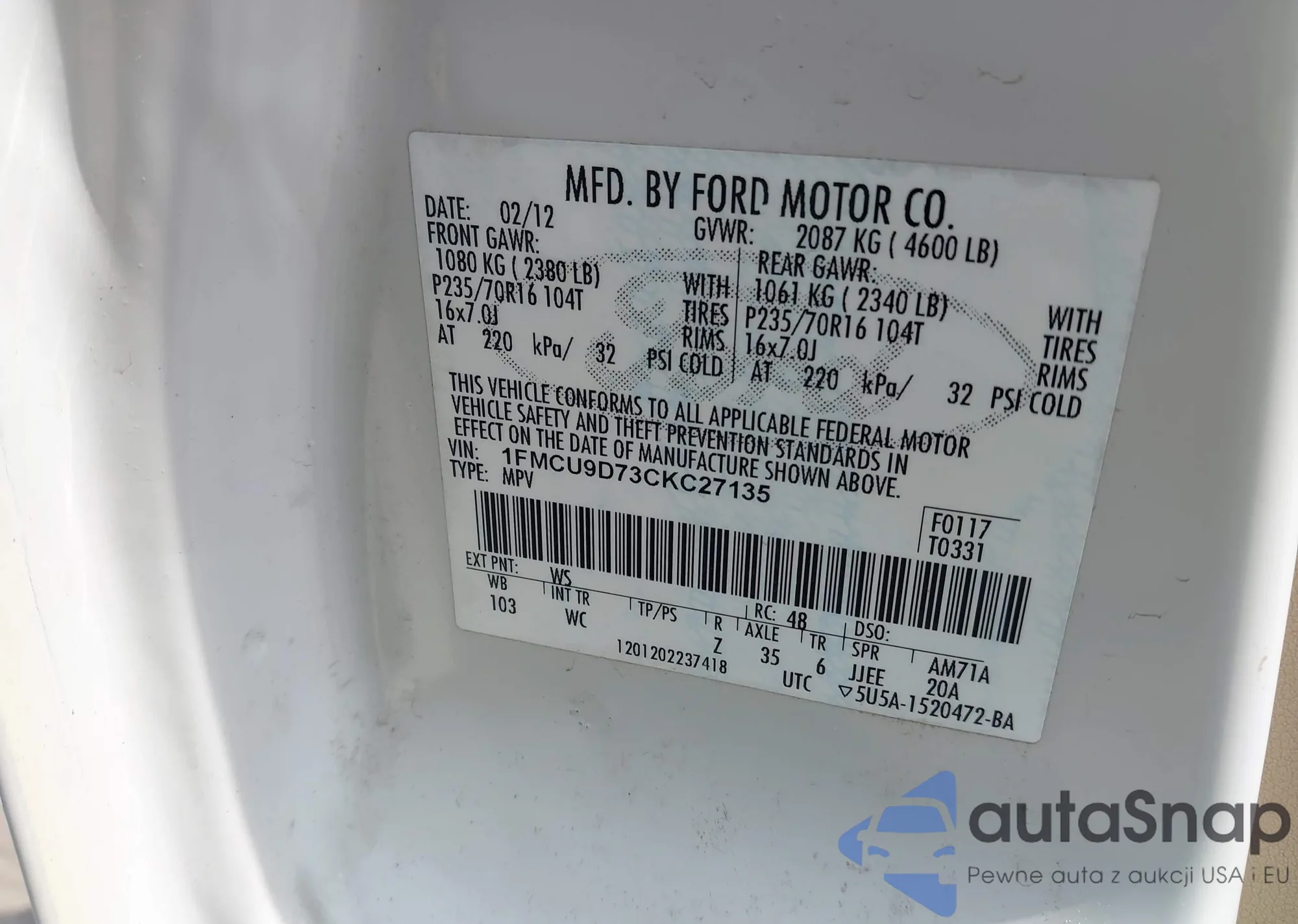 LOT: 42806155 VIN: 1FMCU9D73CKC27135