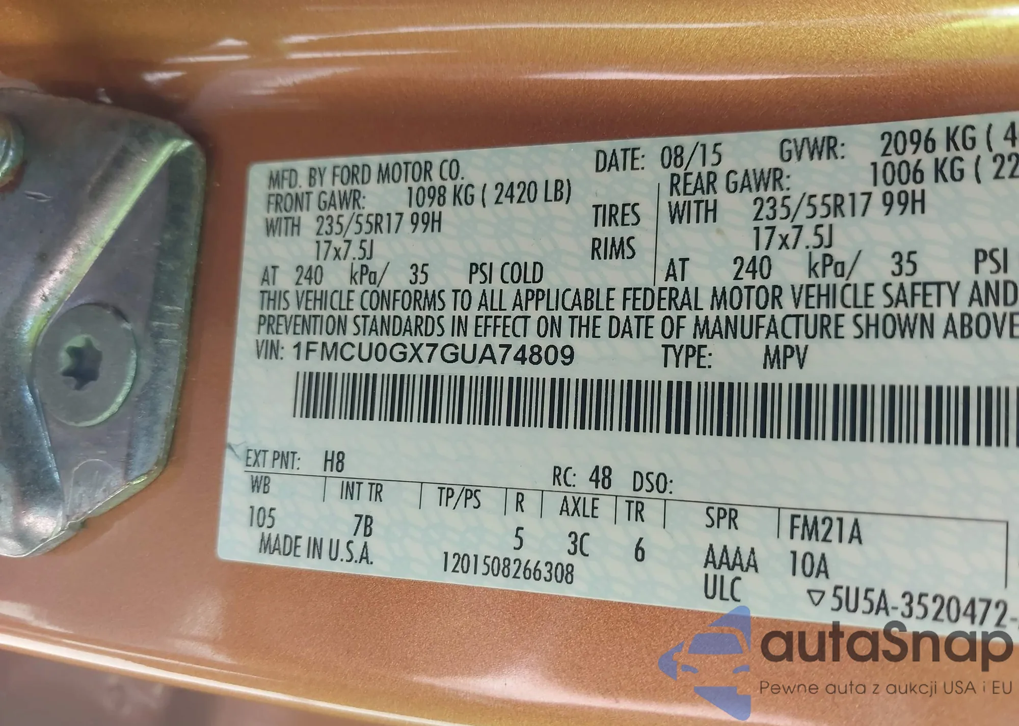LOT: 42885897 VIN: 1FMCU9GD3HUA84071