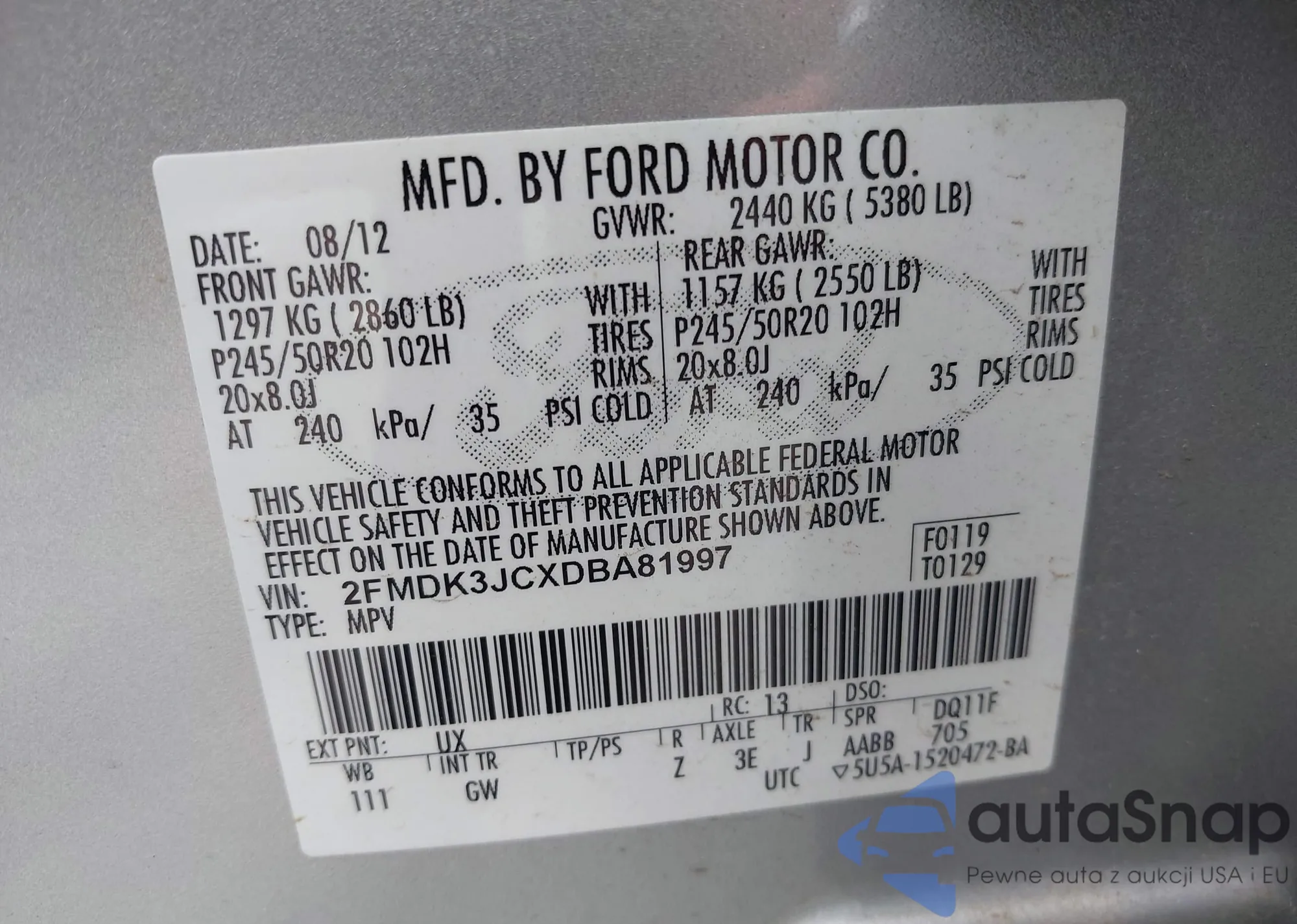 • VIN 2FMDK3JCXDBA81997