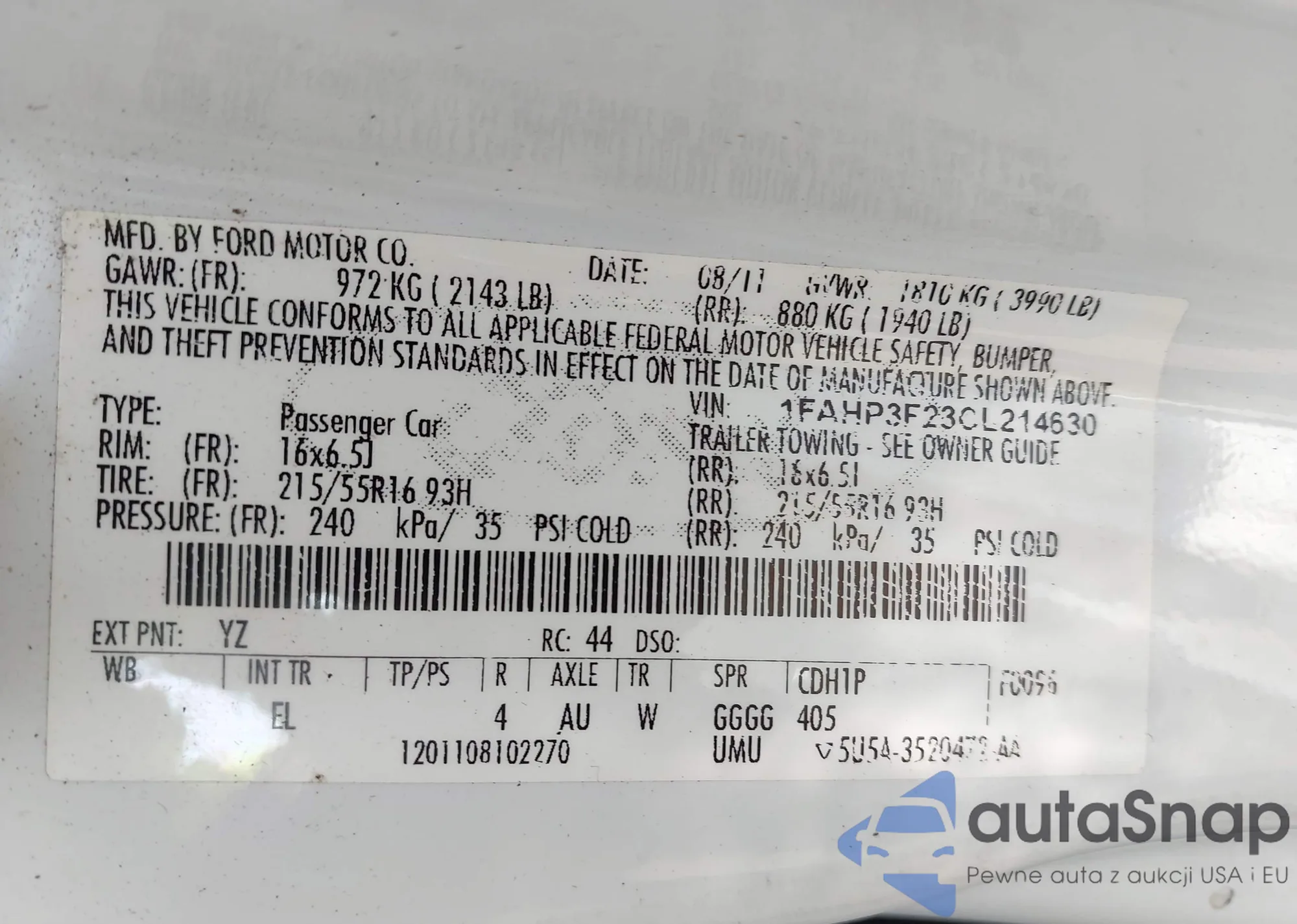 LOT: 42806812 VIN: 1FADP3F25FL381297