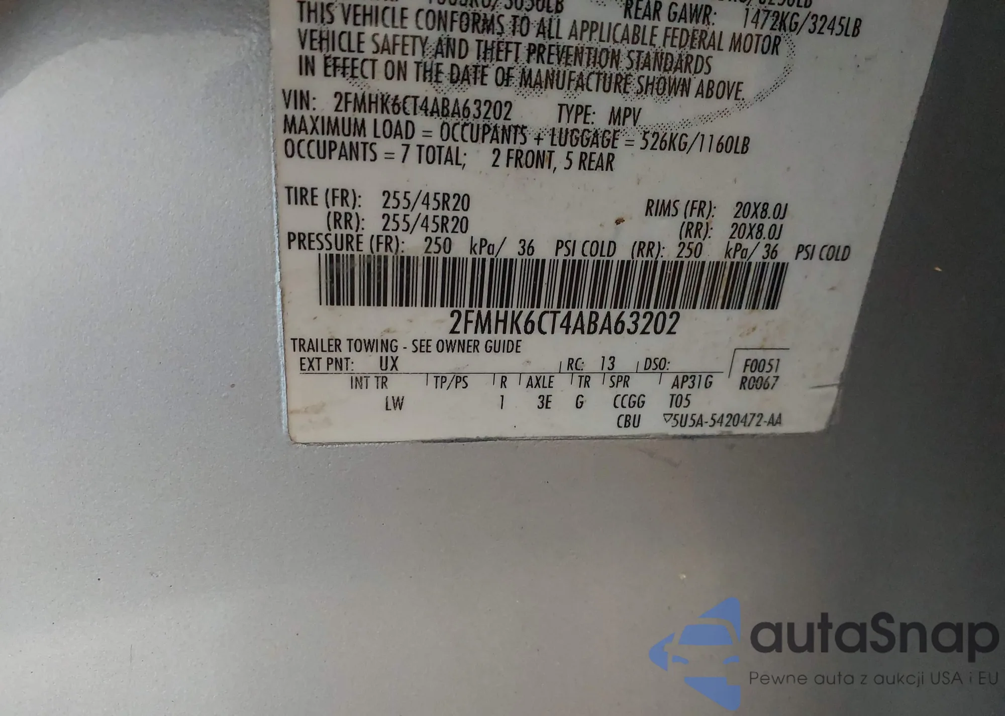 LOT: 42744002 VIN: 1FMCU0G61NUB97395