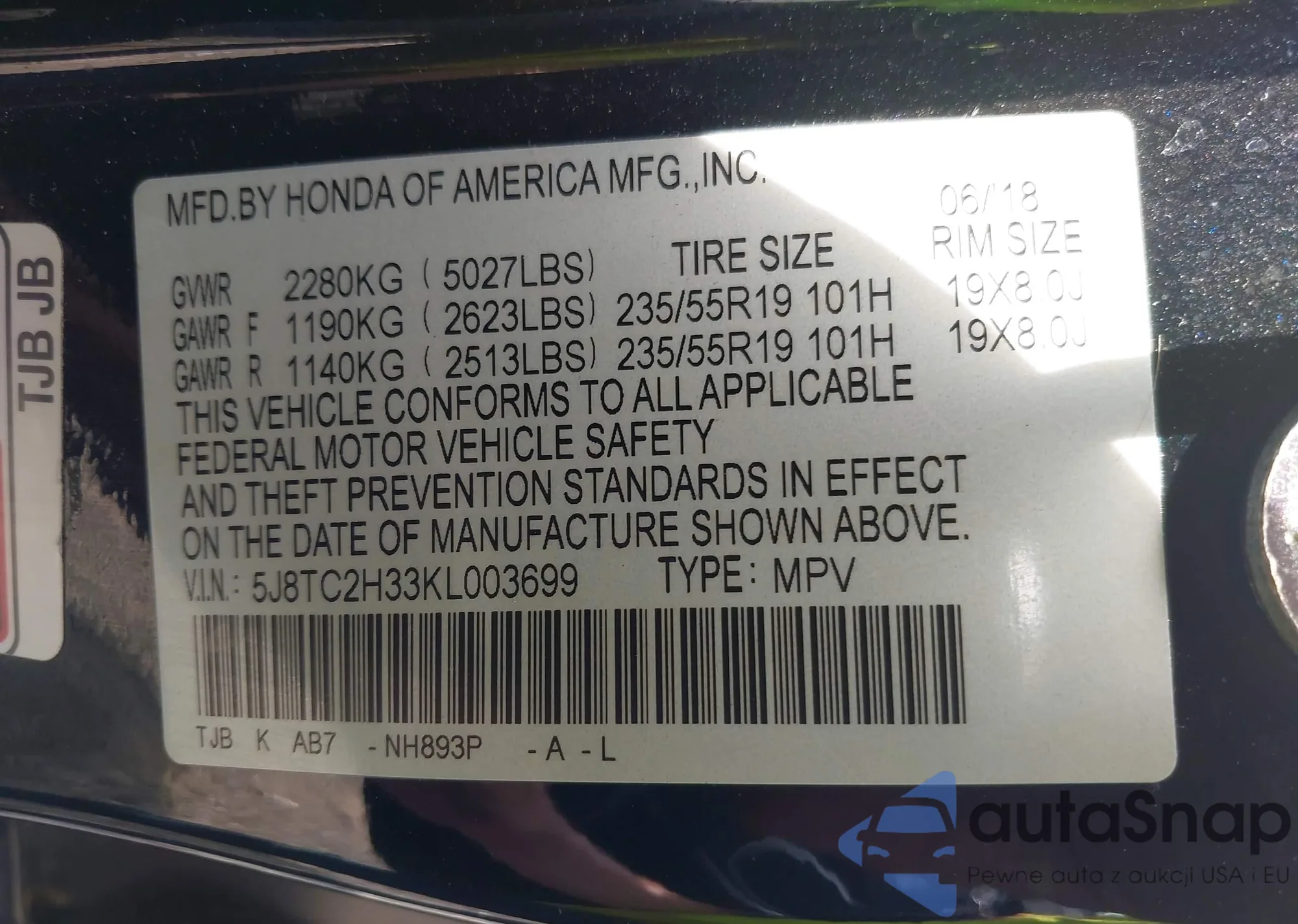• VIN 5J8TC2H33KL003699