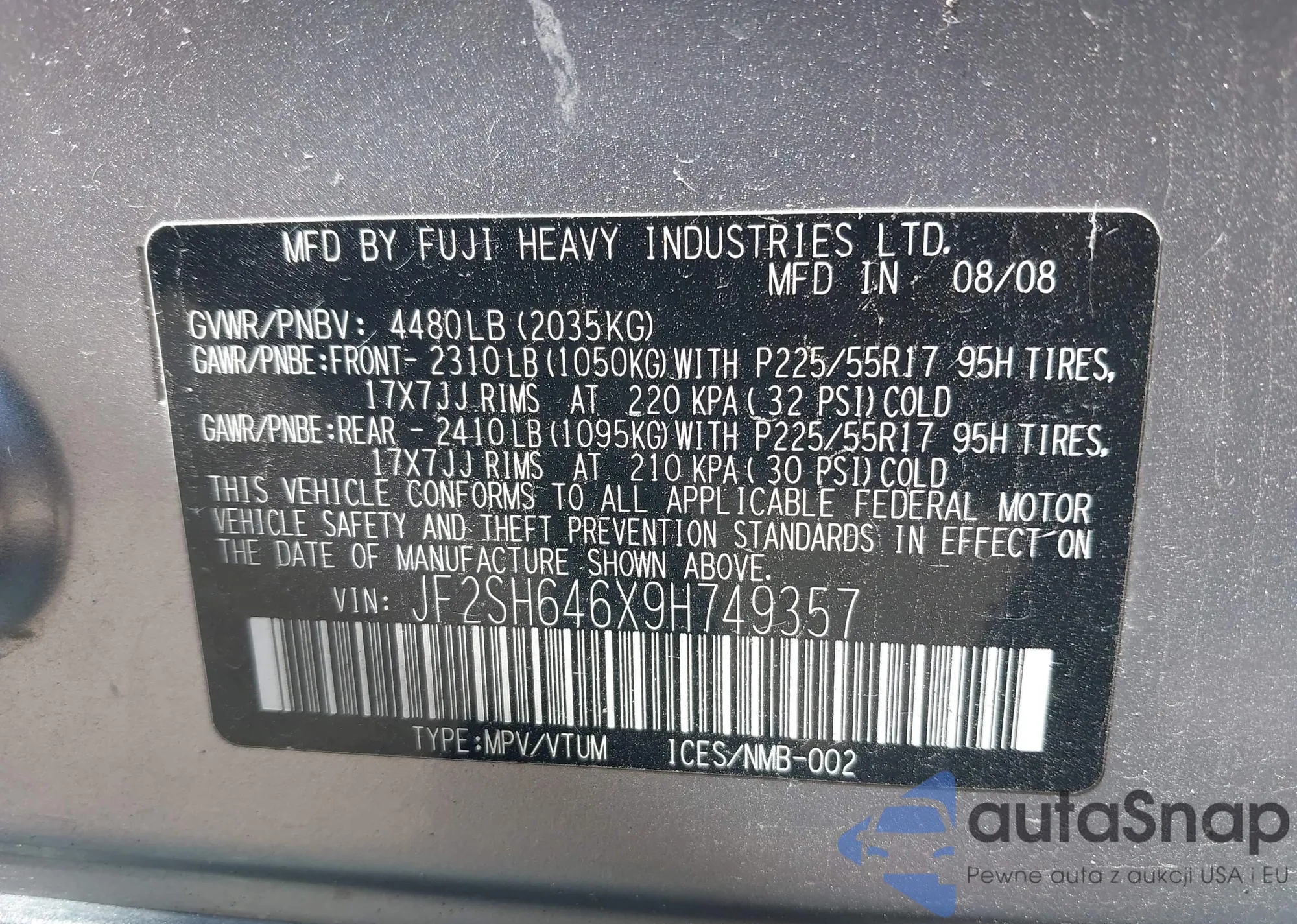 • VIN JF2SH646X9H749357