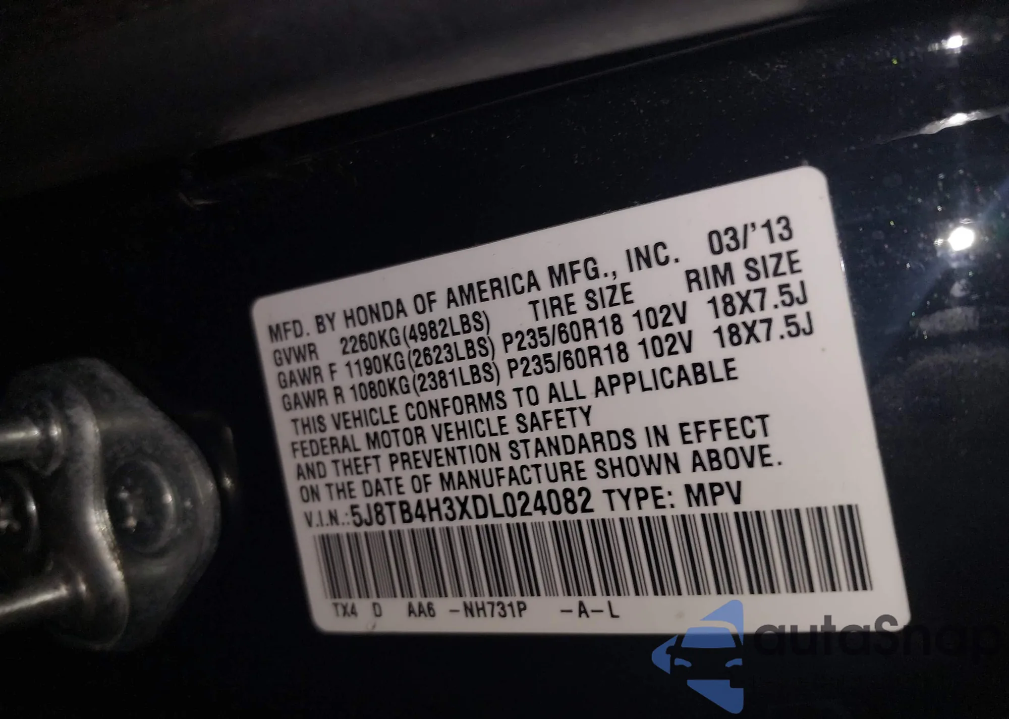 • VIN 5J8TB4H3XDL024082