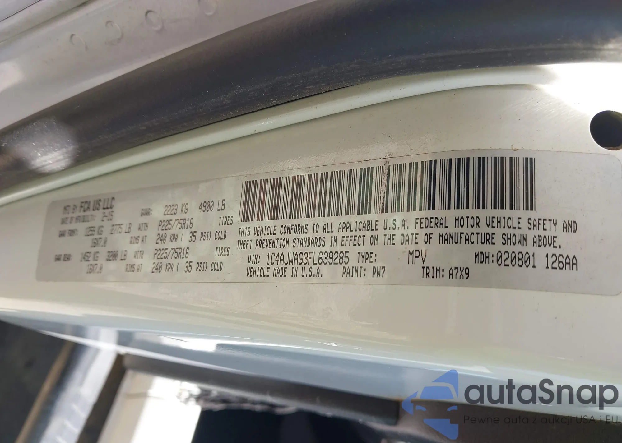 • VIN 1C4AJWAG3FL639285