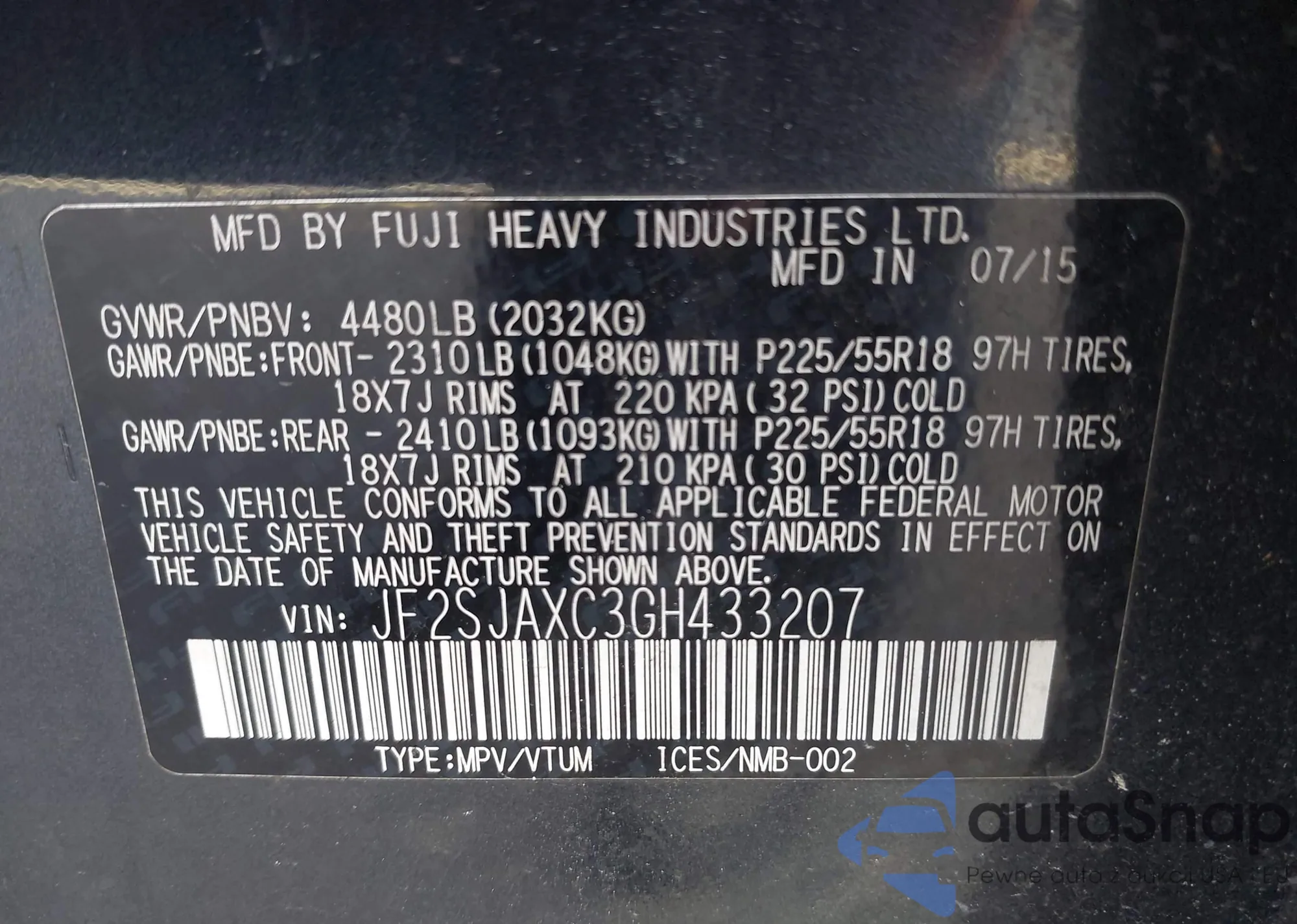 • VIN JF2SJAXC3GH433207