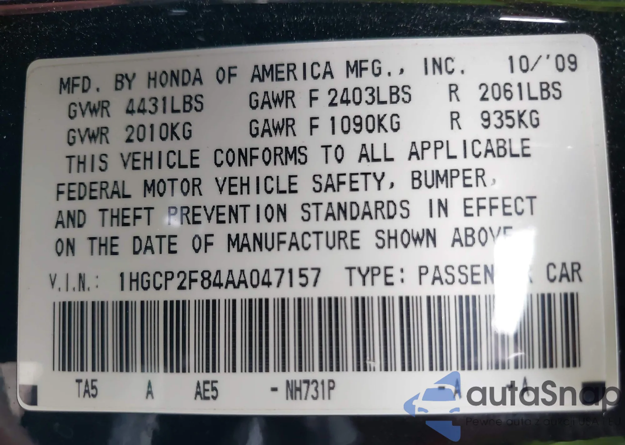 • VIN 1HGCP2F84AA047157