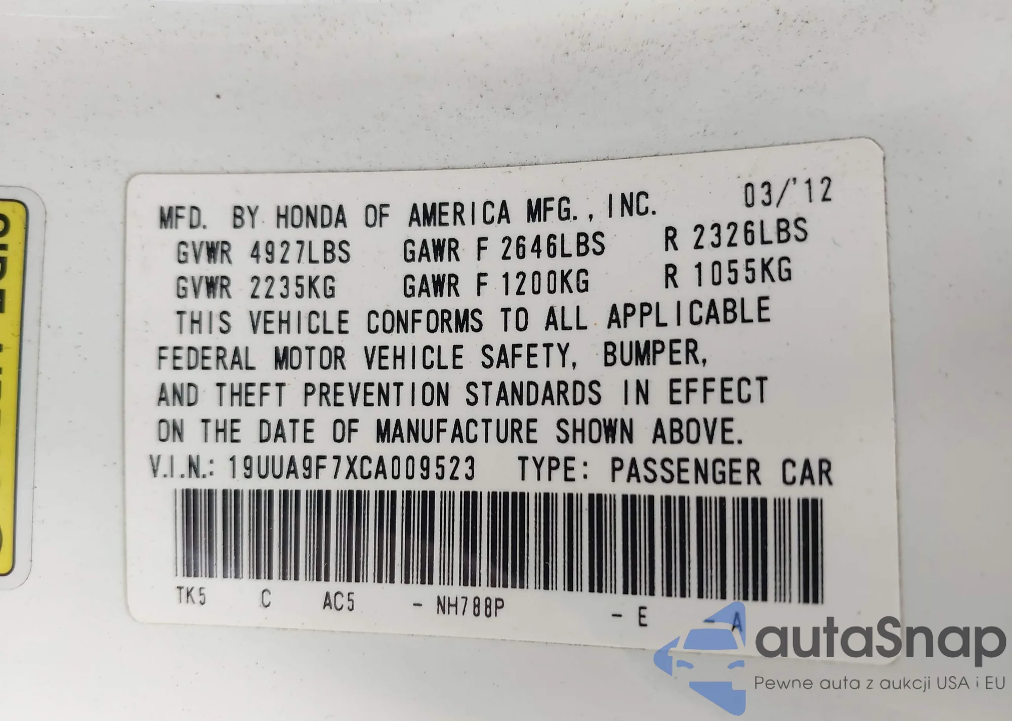 LOT: 42697727 VIN: 19UUA9F7XCA009523