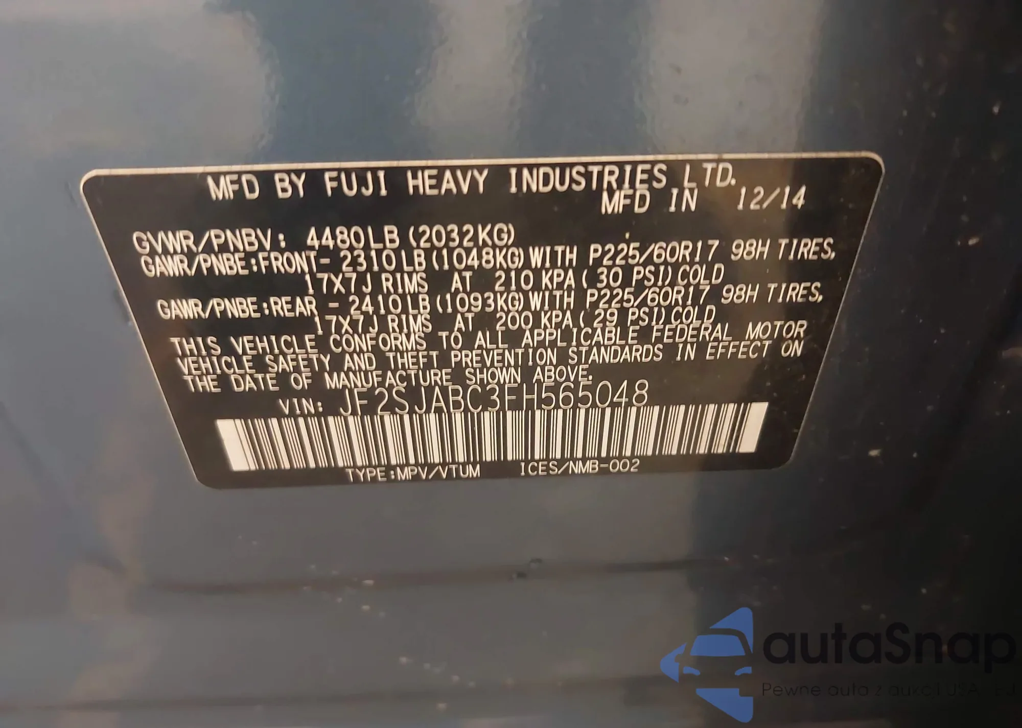 LOT: 42705968 VIN: JF2SJABC3FH565048