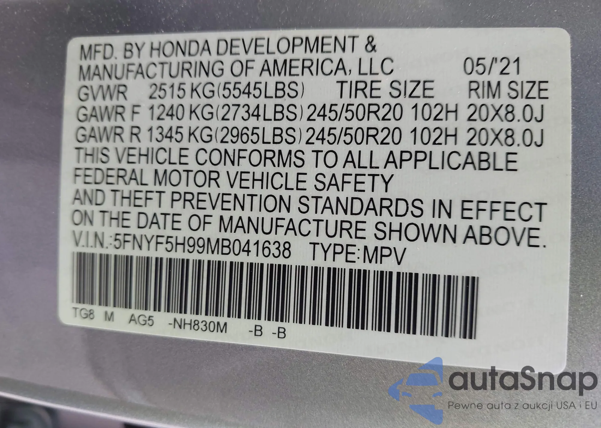 LOT: 42112915 VIN: 5FNYF5H99MB041638