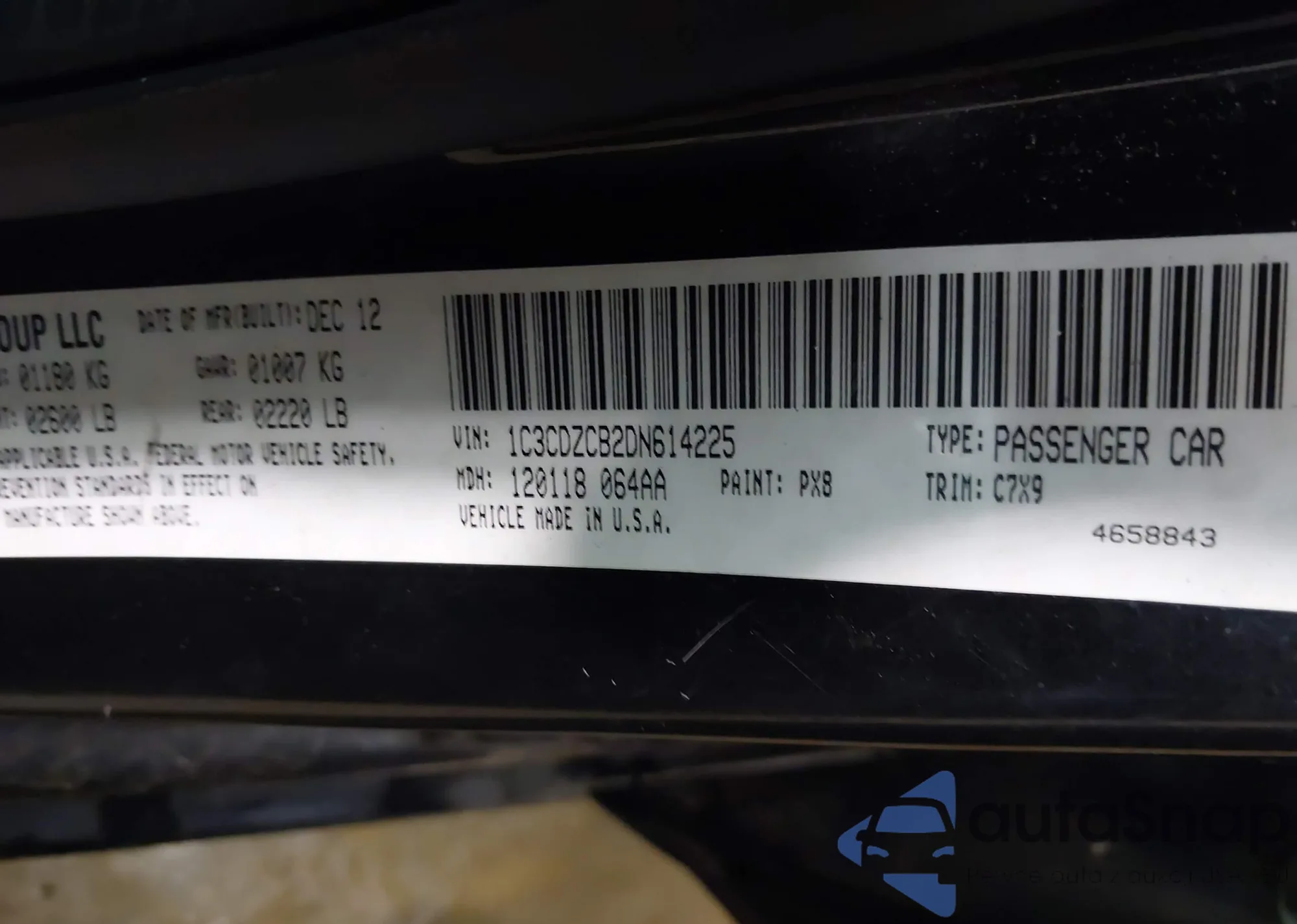 LOT: 42657308 VIN: 1C3CDZCB2DN614225