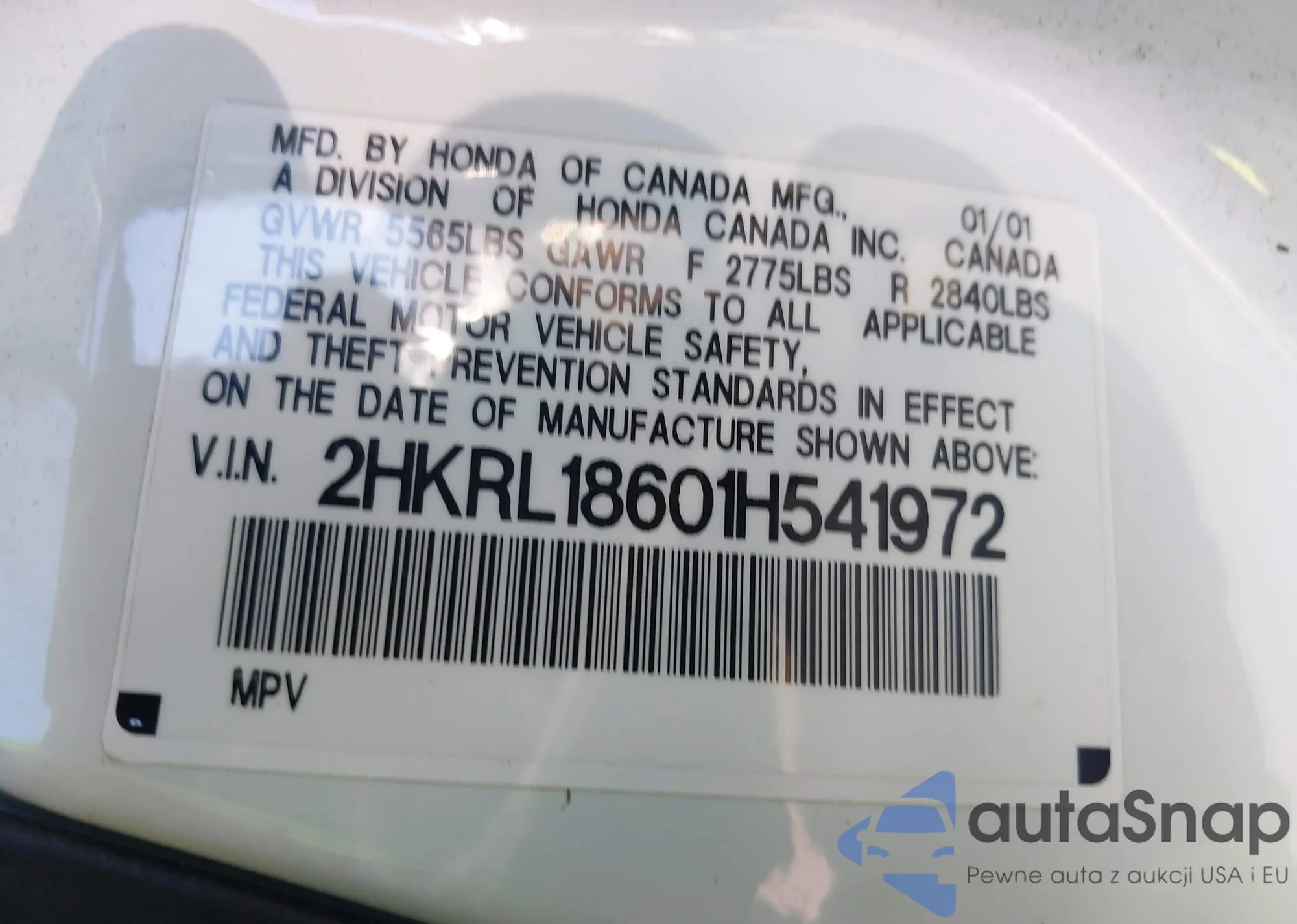 • VIN 2HKRL18601H541972