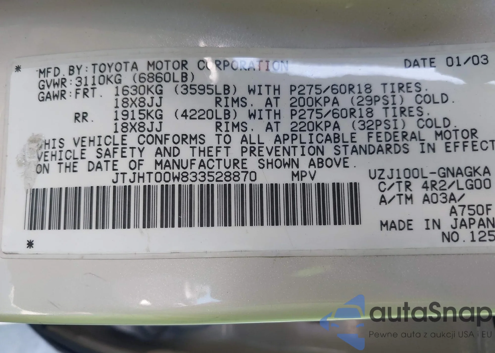 LOT: 42862272 VIN: JTJHT00W833528870