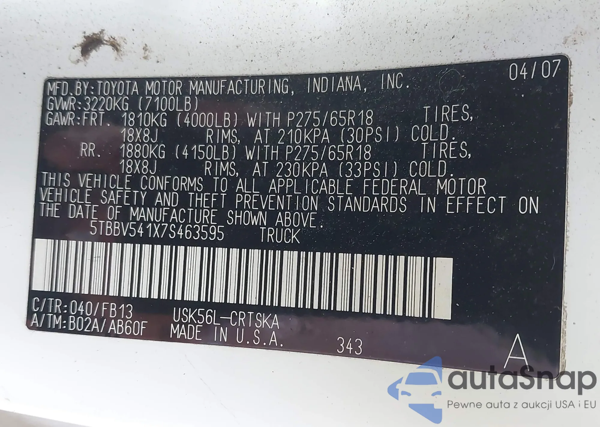 LOT: 42730821 VIN: KMHCM36C37U046294