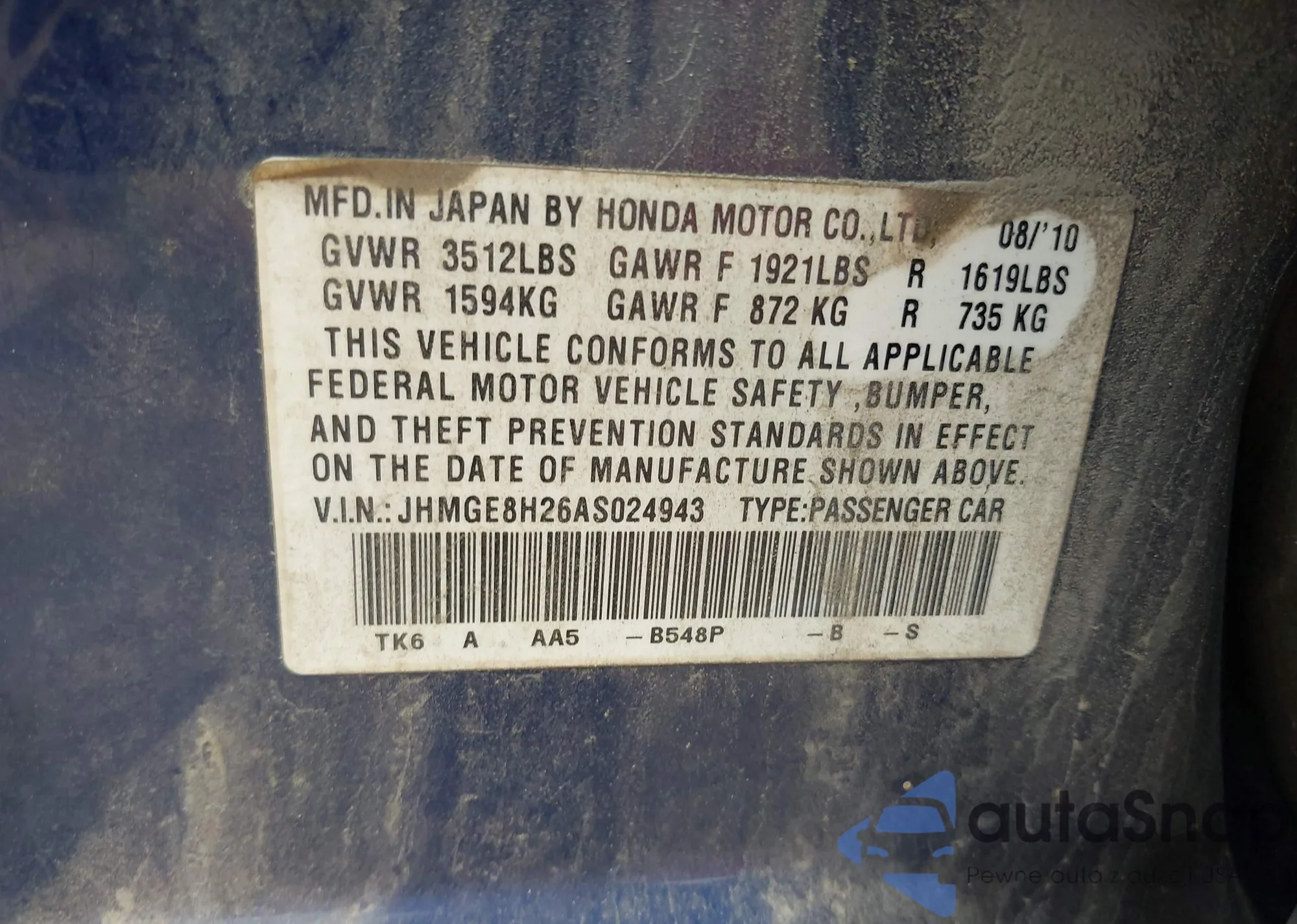 • VIN 1HGCP2F36AA075756