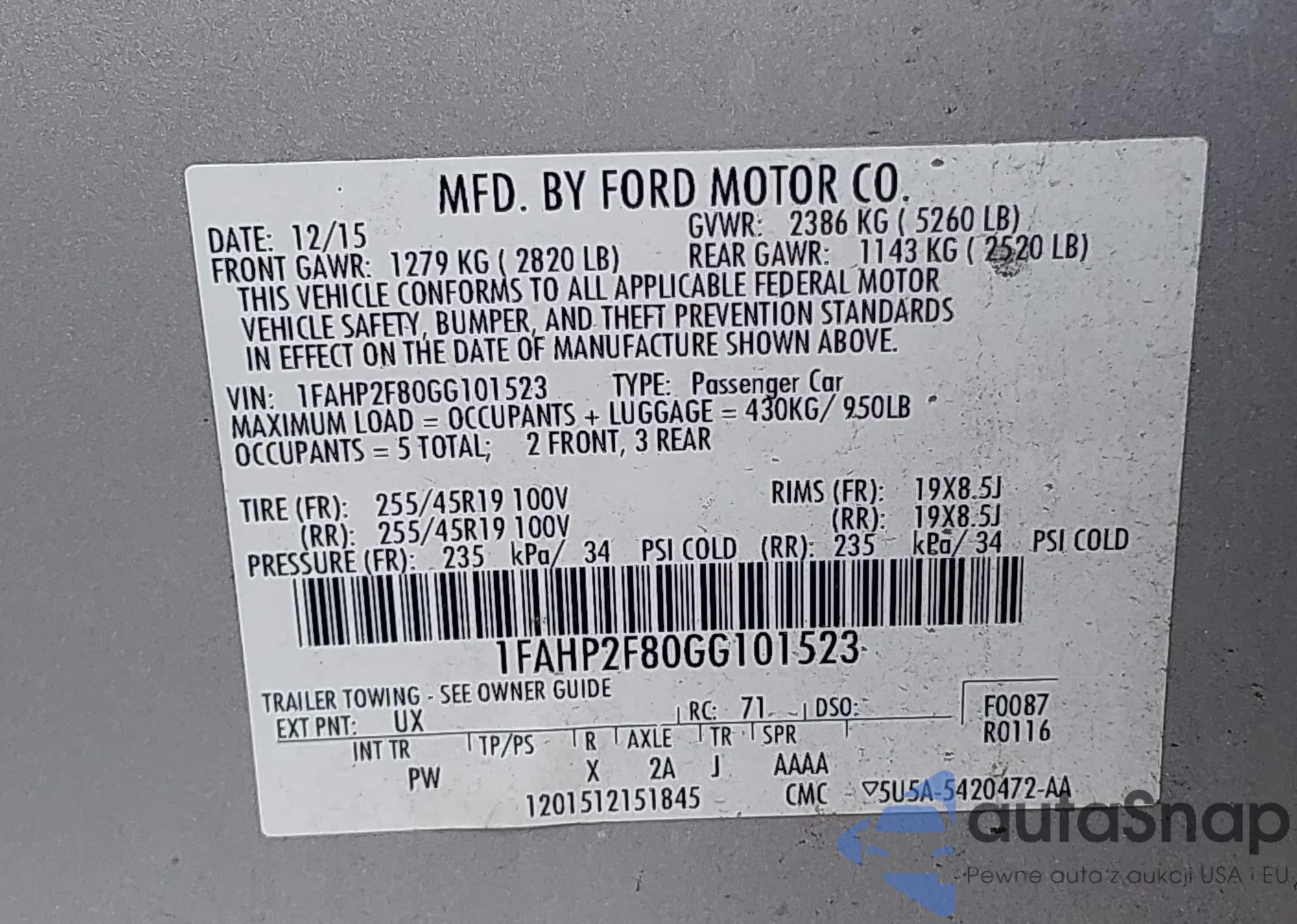 LOT: 42802253 VIN: 1FAHP2F80GG101523