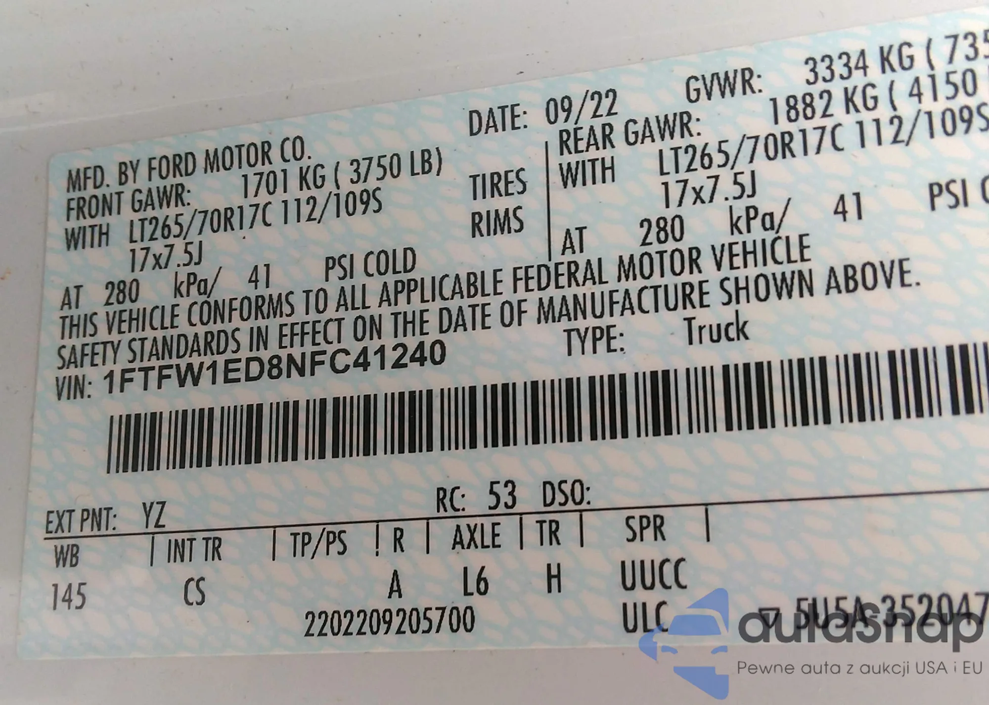 LOT: 42946695 VIN: 1FTFW1ED8NFC41240