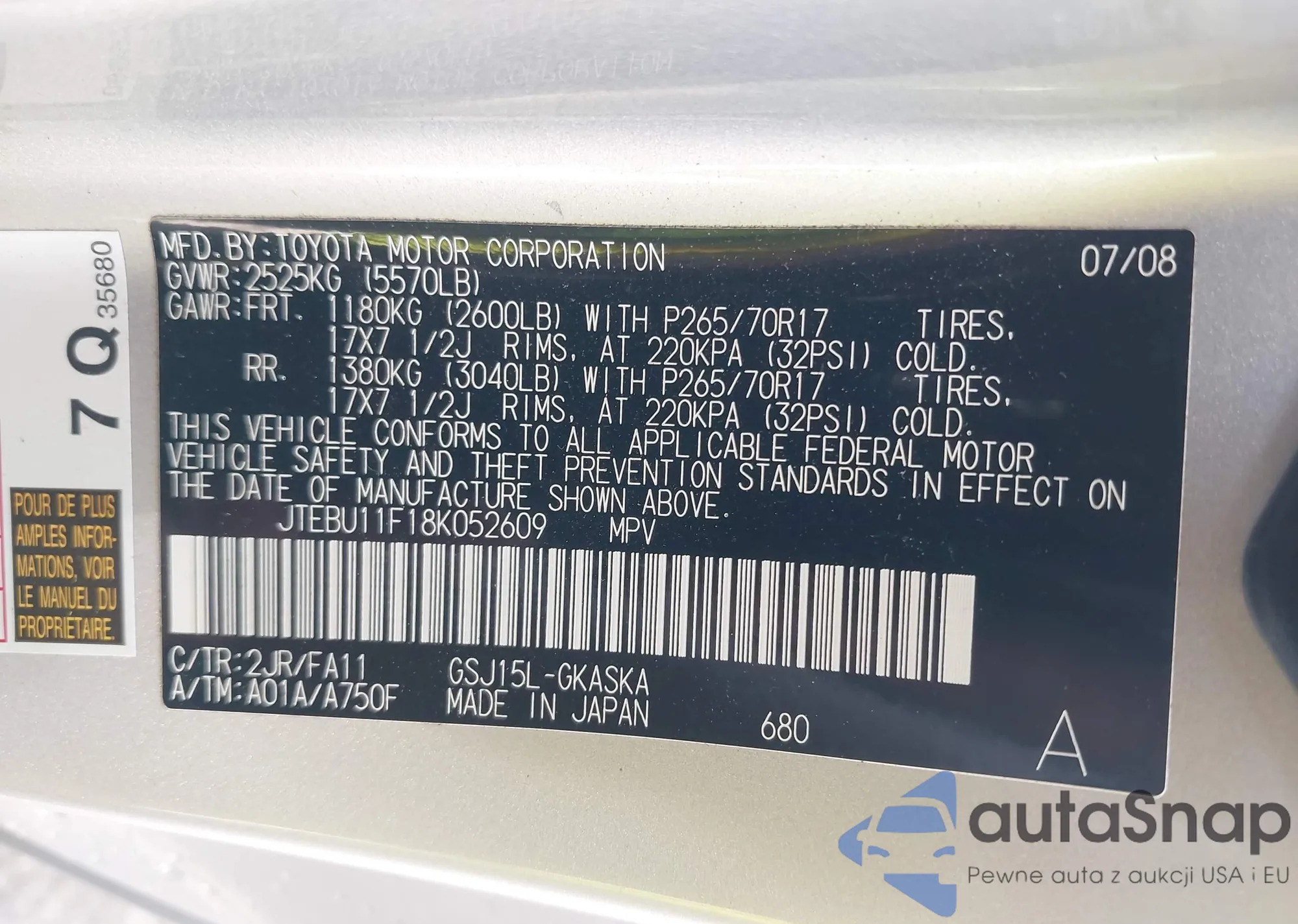 LOT: 42587745 VIN: JTEBU11F18K052609