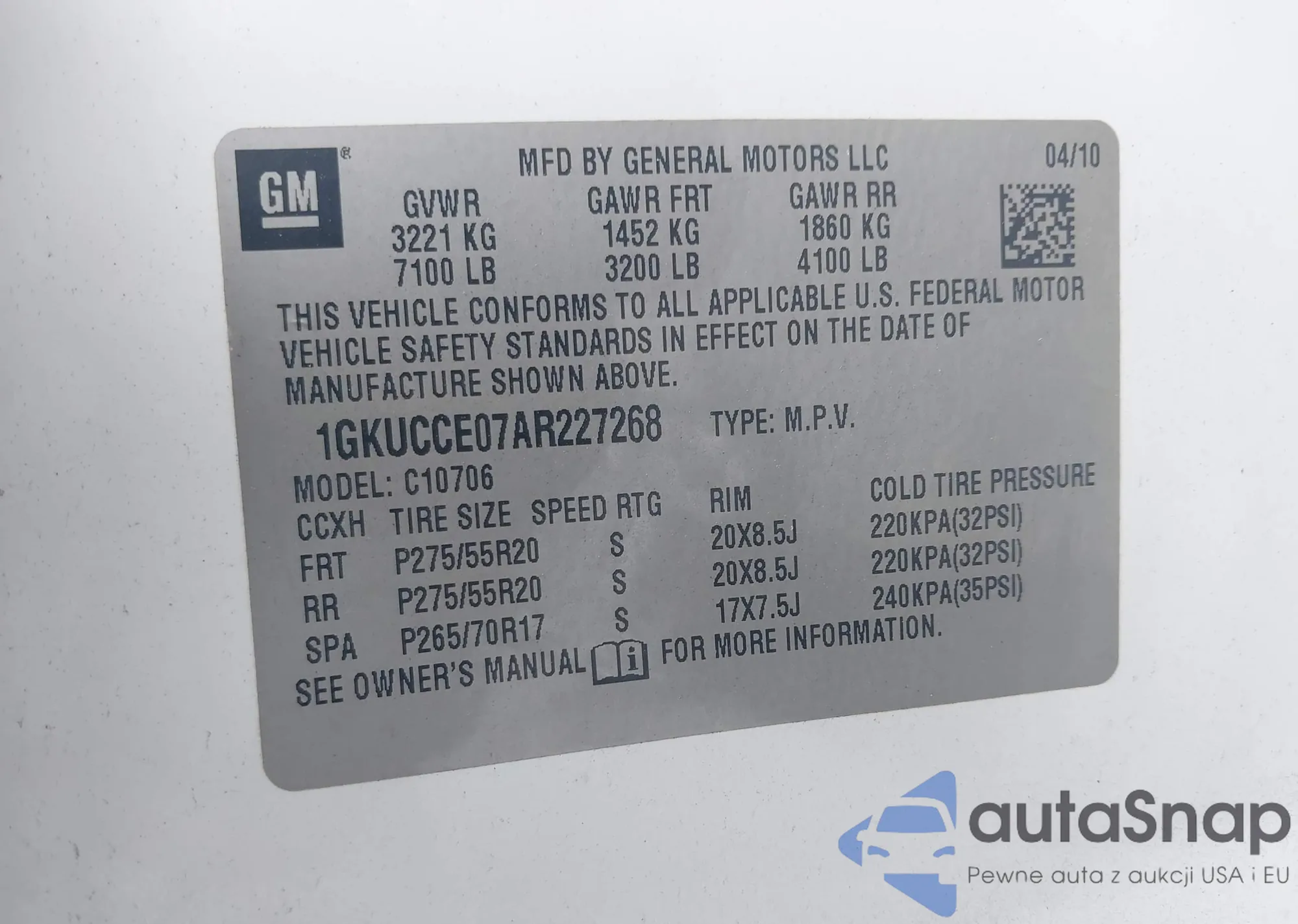 • VIN 1GKUCCE07AR227268