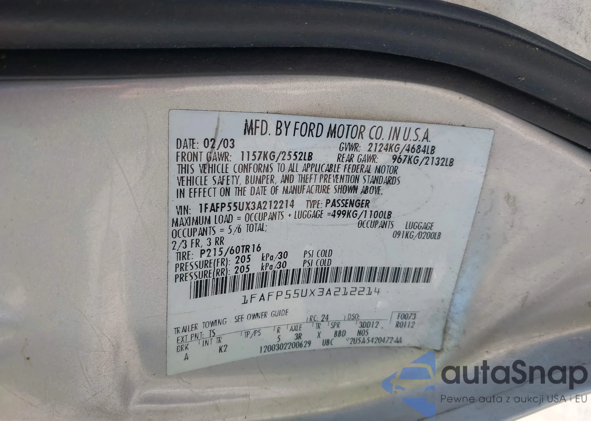 LOT: 42544562 VIN: 1FAFP55UX3A212214