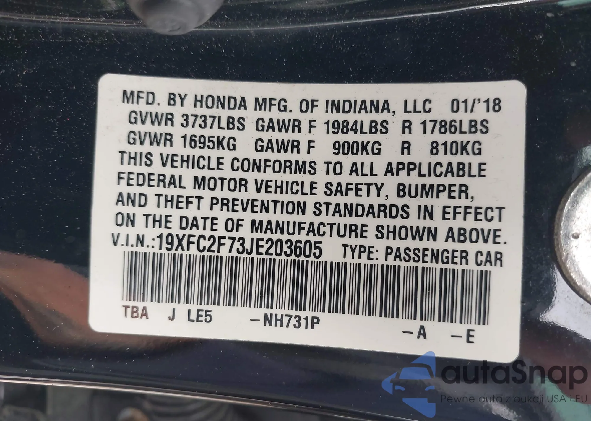 • VIN 19XFC2F73JE203605