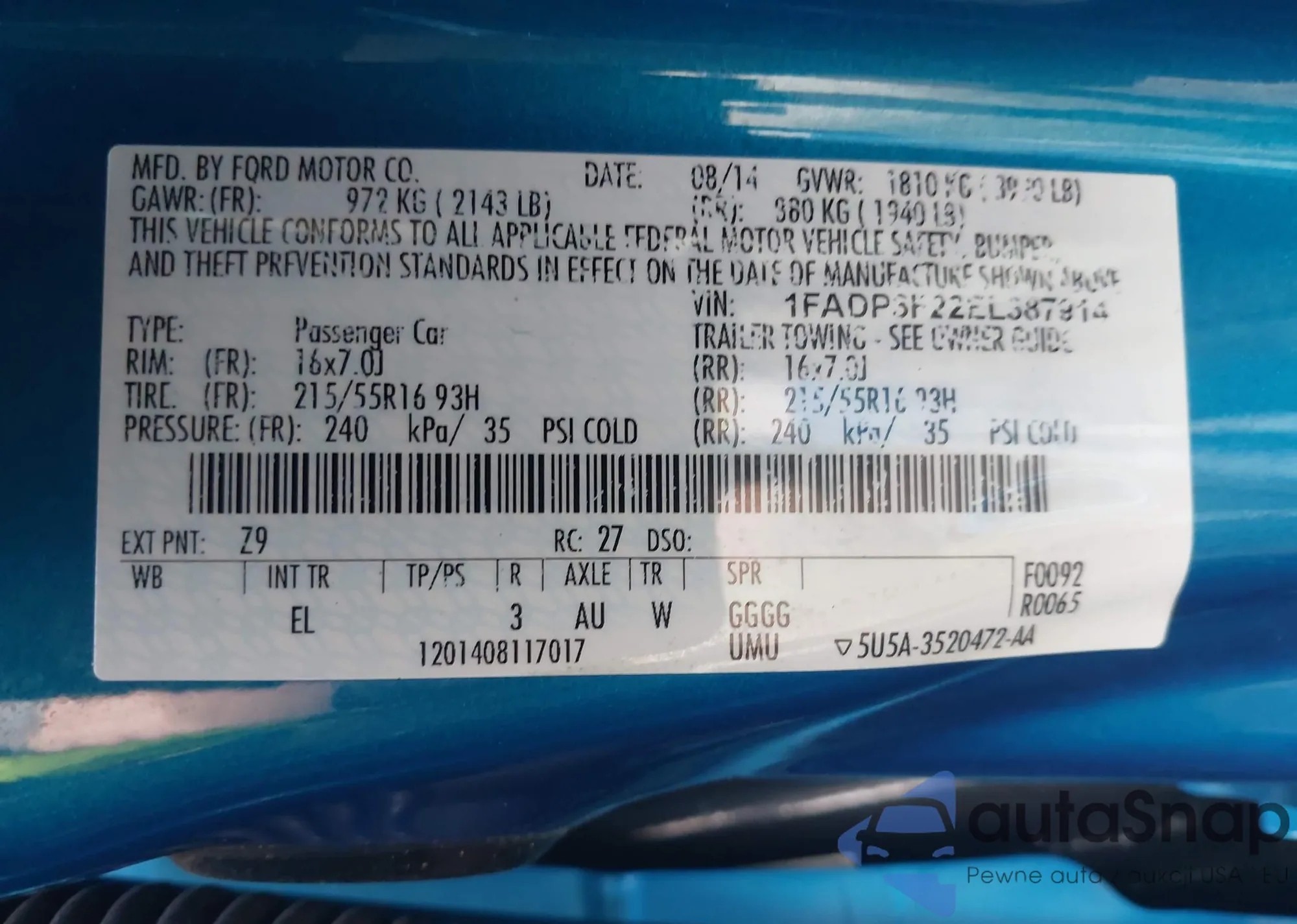 • VIN 1FADP3F22EL387914