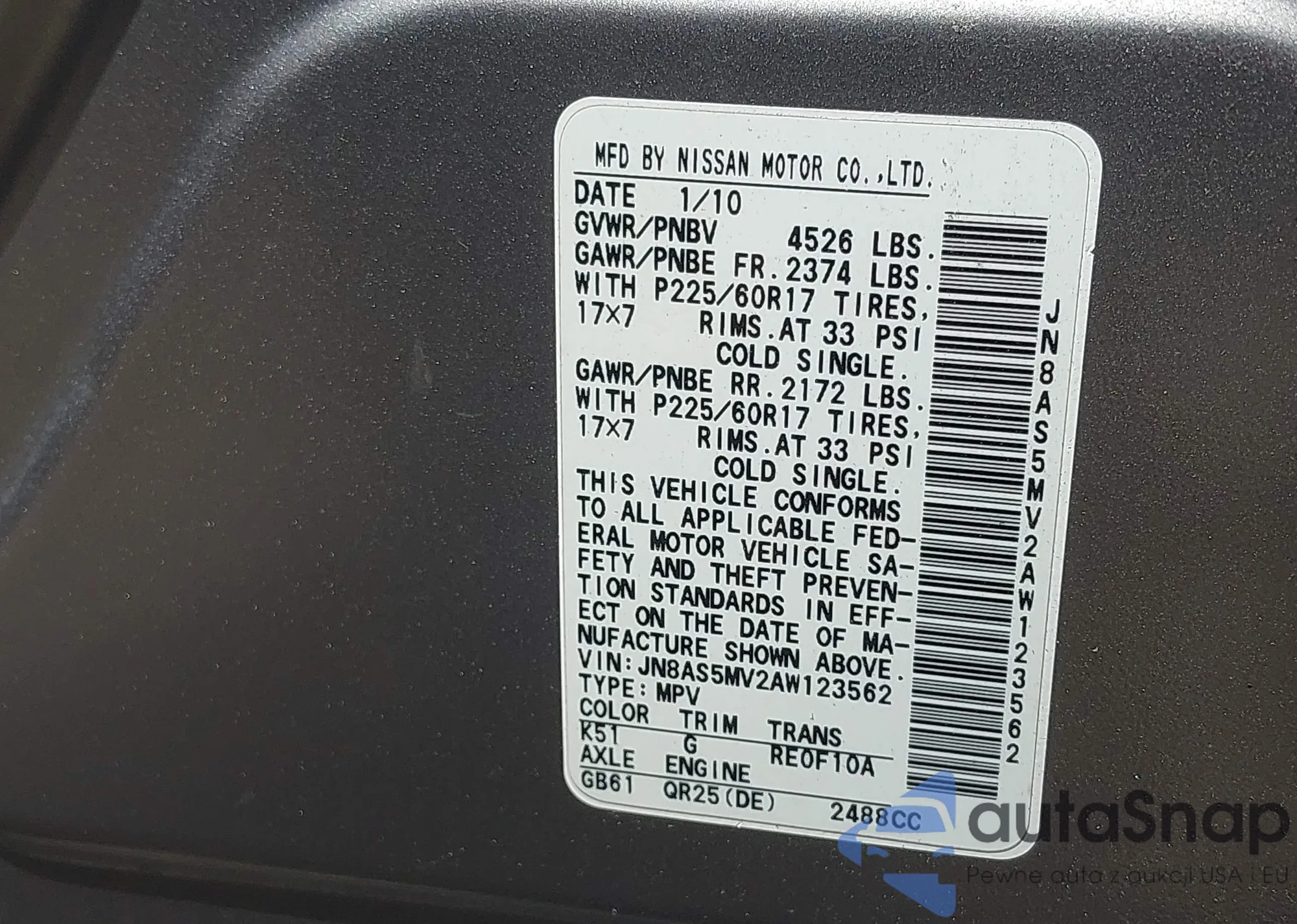 • VIN JN8AS5MV2AW123562