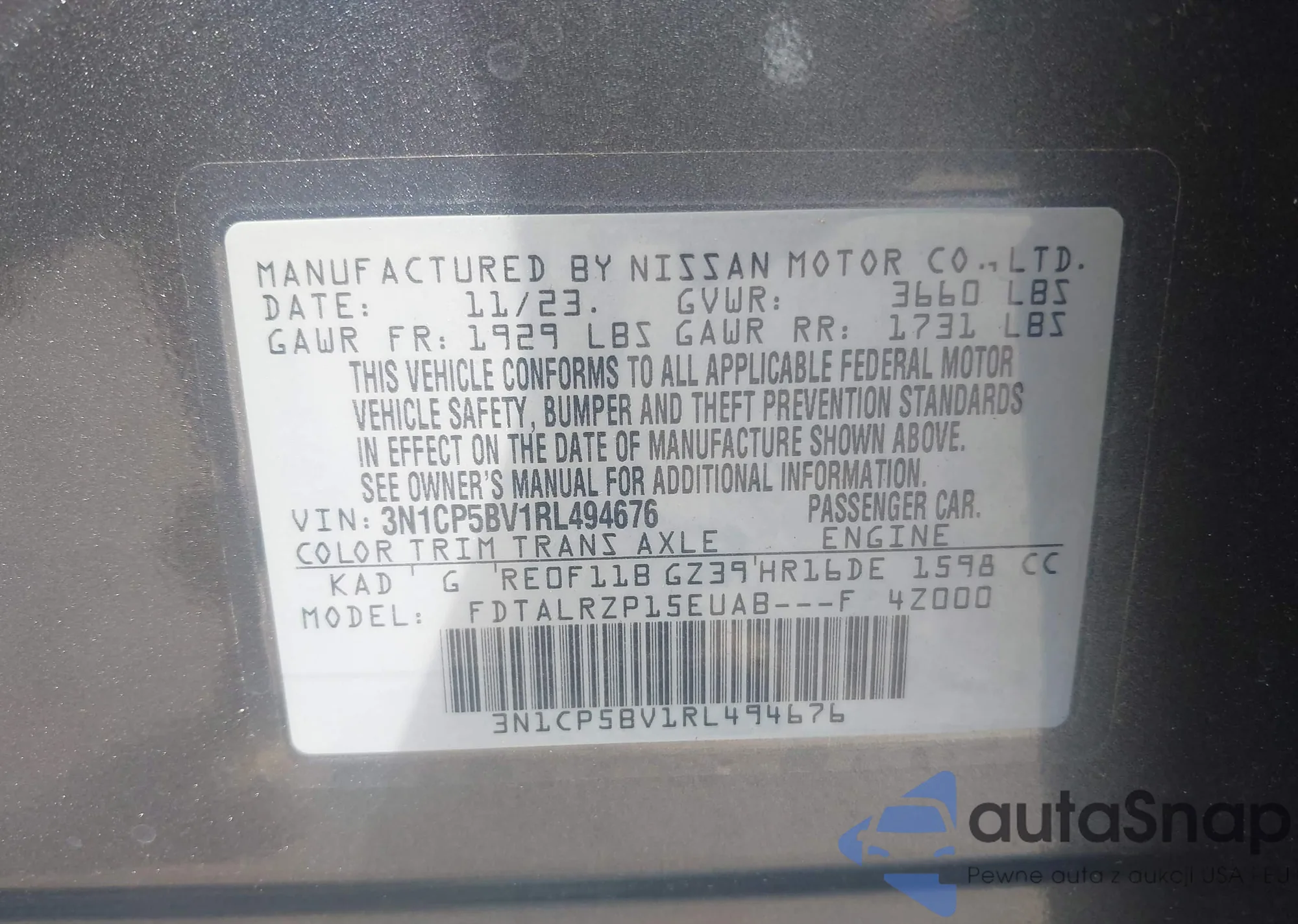 • VIN 3N1CP5BV1RL494676