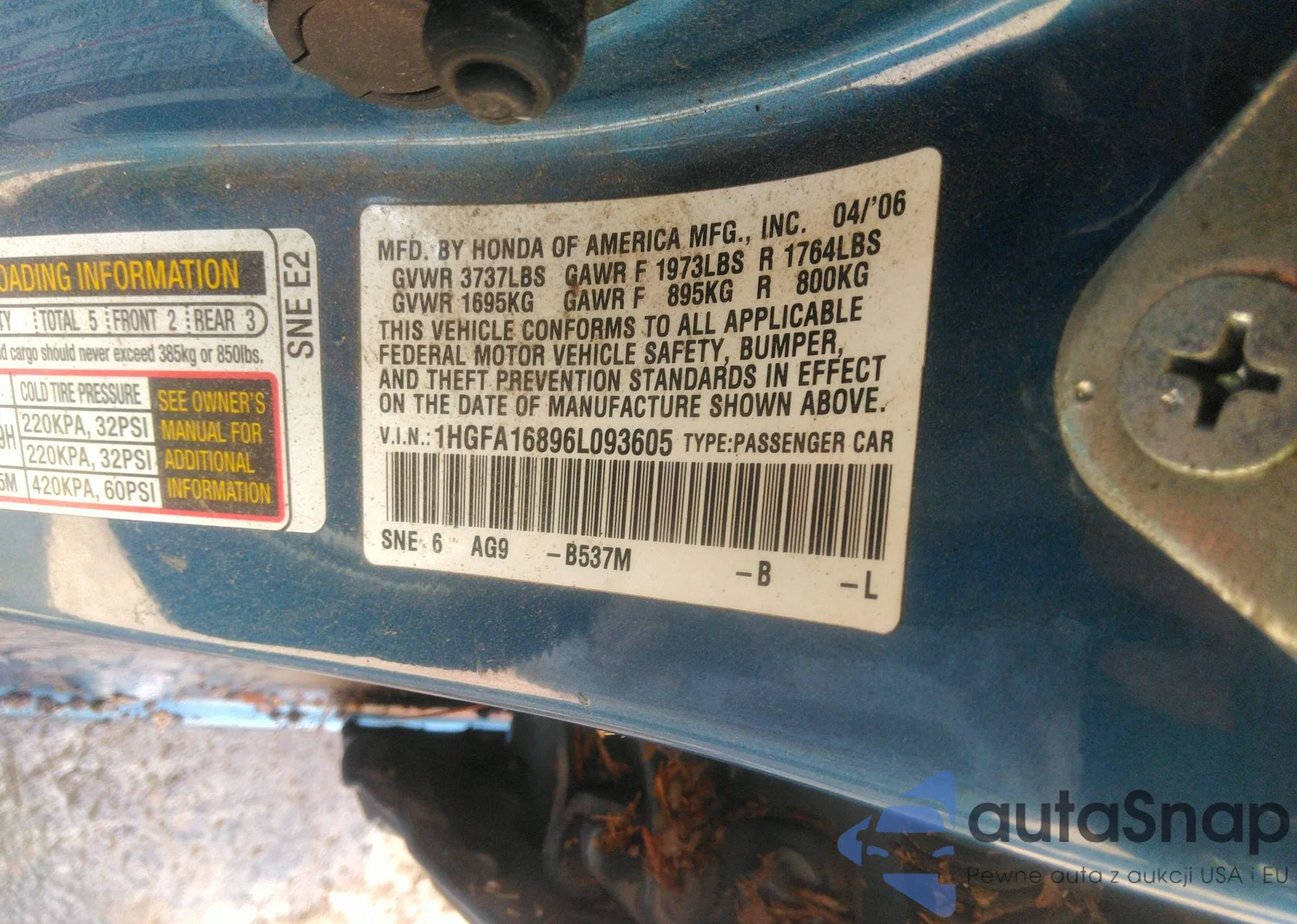 LOT: 42761600 VIN: 1HGFA16896L093605