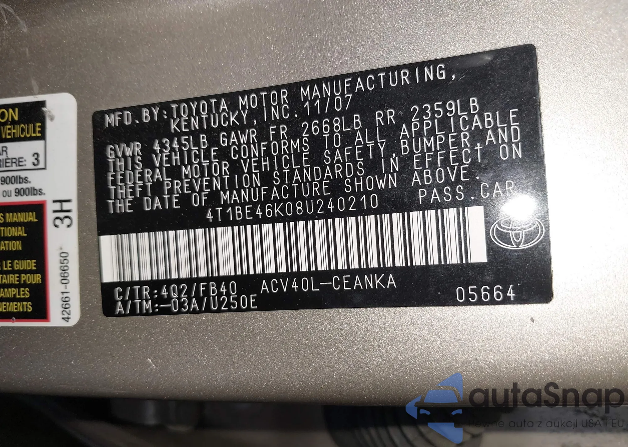 • VIN 4T1BF1FK1GU218727
