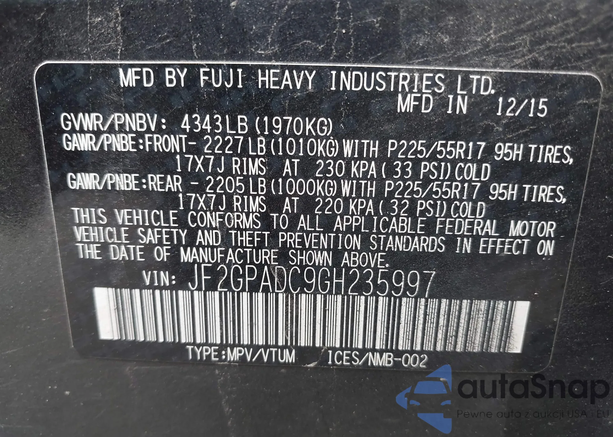 LOT: 42702893 VIN: JF2GPADC9GH235997