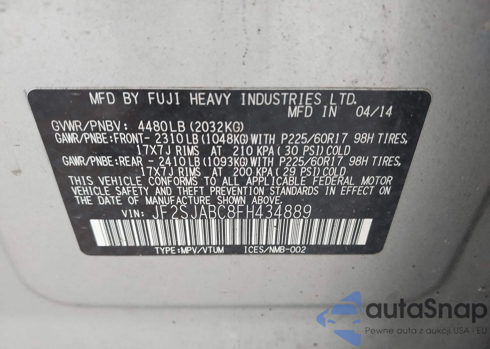 • VIN JF2SJABC8FH434889
