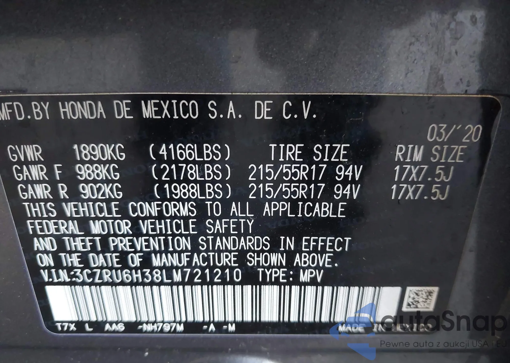 • VIN 3CZRU6H38LM721210