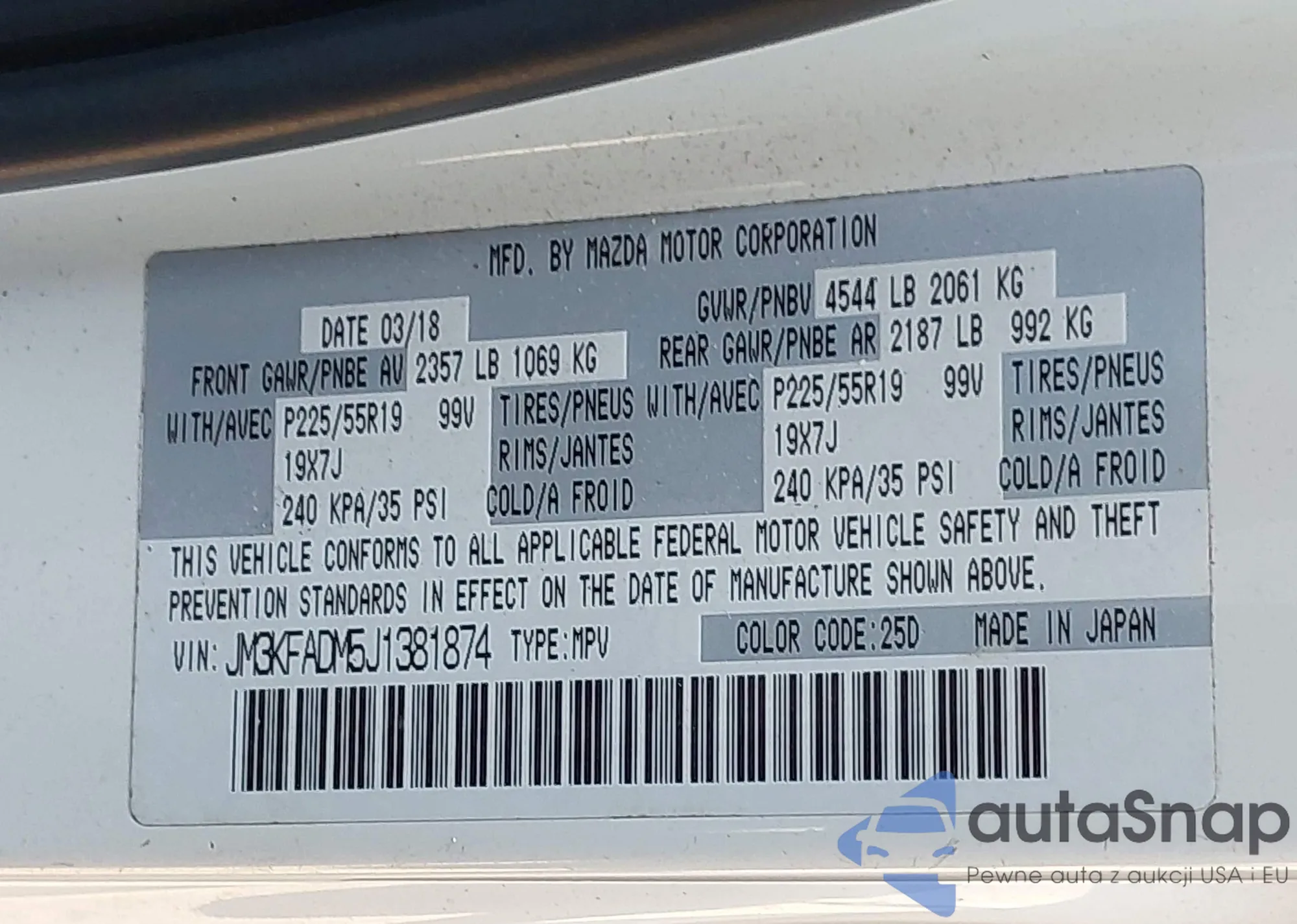 LOT: 42891524 VIN: JM3KFADM5J1381874