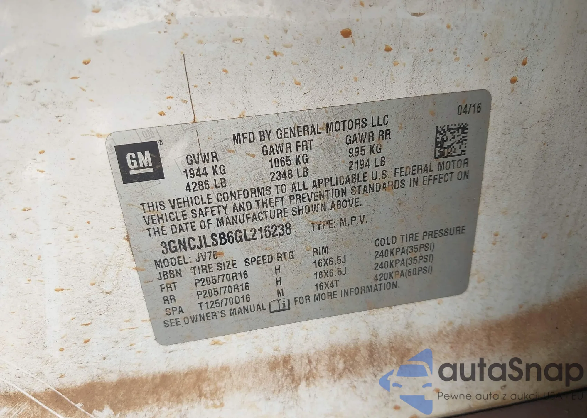 LOT: 42344304 VIN: 3GNCJLSB6GL216238
