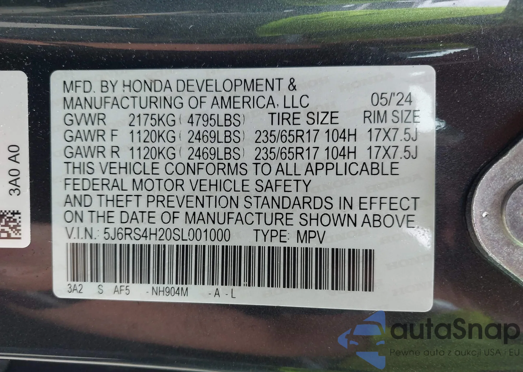 • VIN 5J6RS4H20SL001000