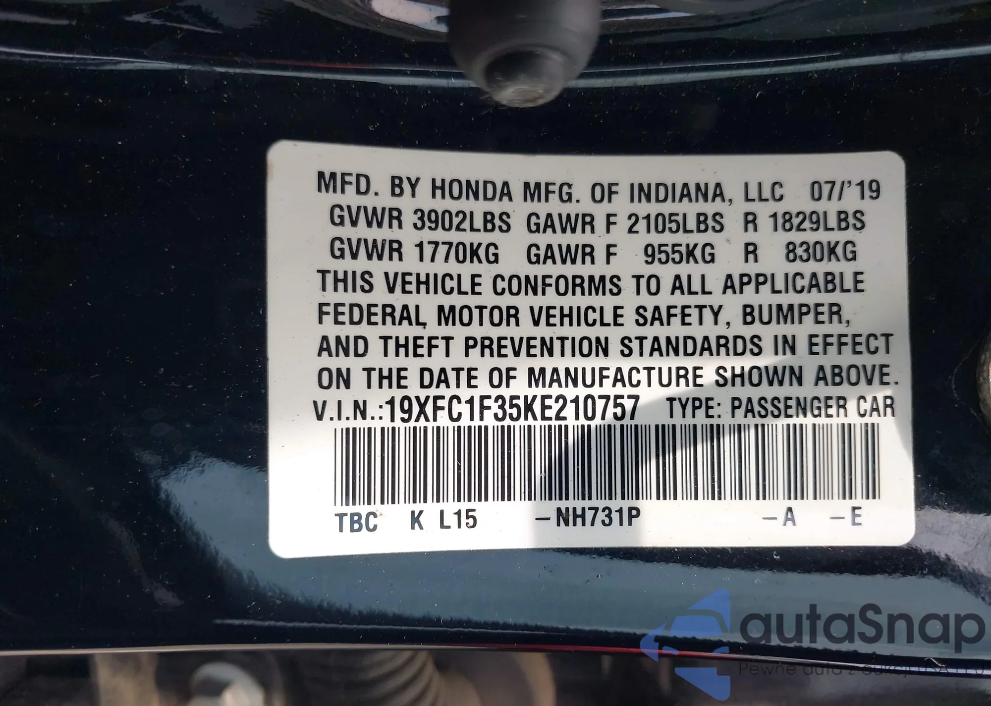 LOT: 42601703 VIN: 19XFC1F35KE210757