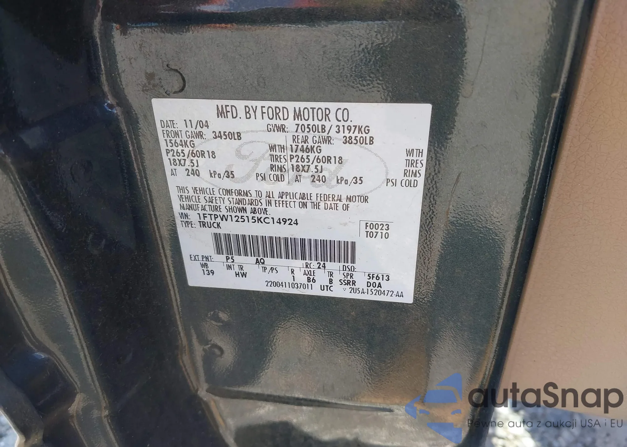 LOT: 42639131 VIN: 1FTPW12515KC14924